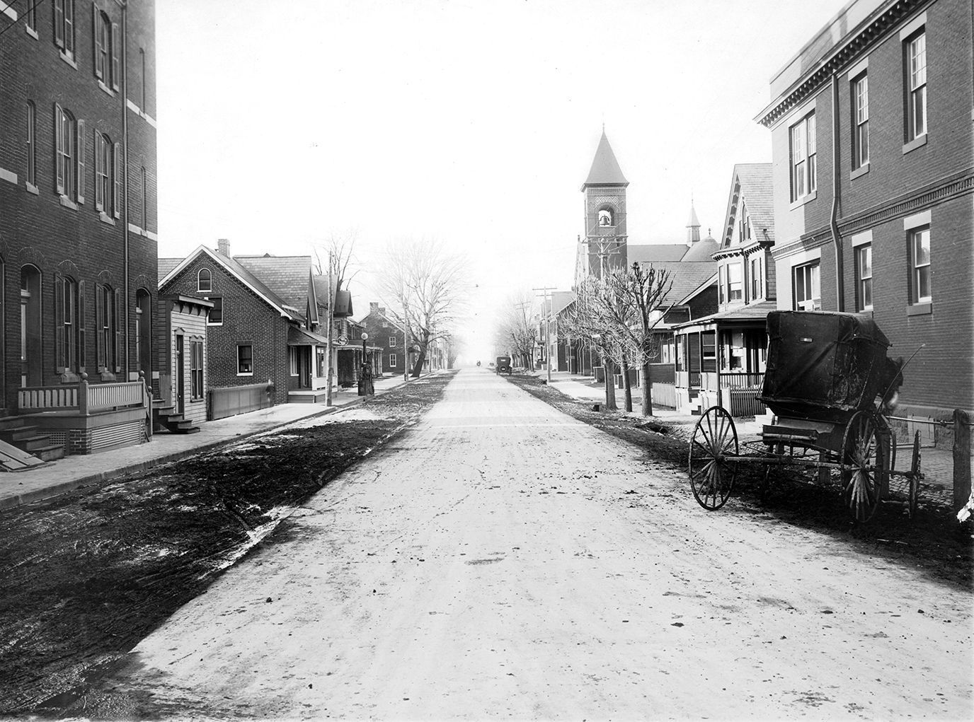 Black and white photograph of a road through Taneytown looking north. The photograph shows the road, half paved, with the sides remaining as dirt. The street is line with buildings and houses on each side, while on the proper right side of the photograph is a carriage. The photograph is not mounted or matted and measures 7.25"x 9.875.