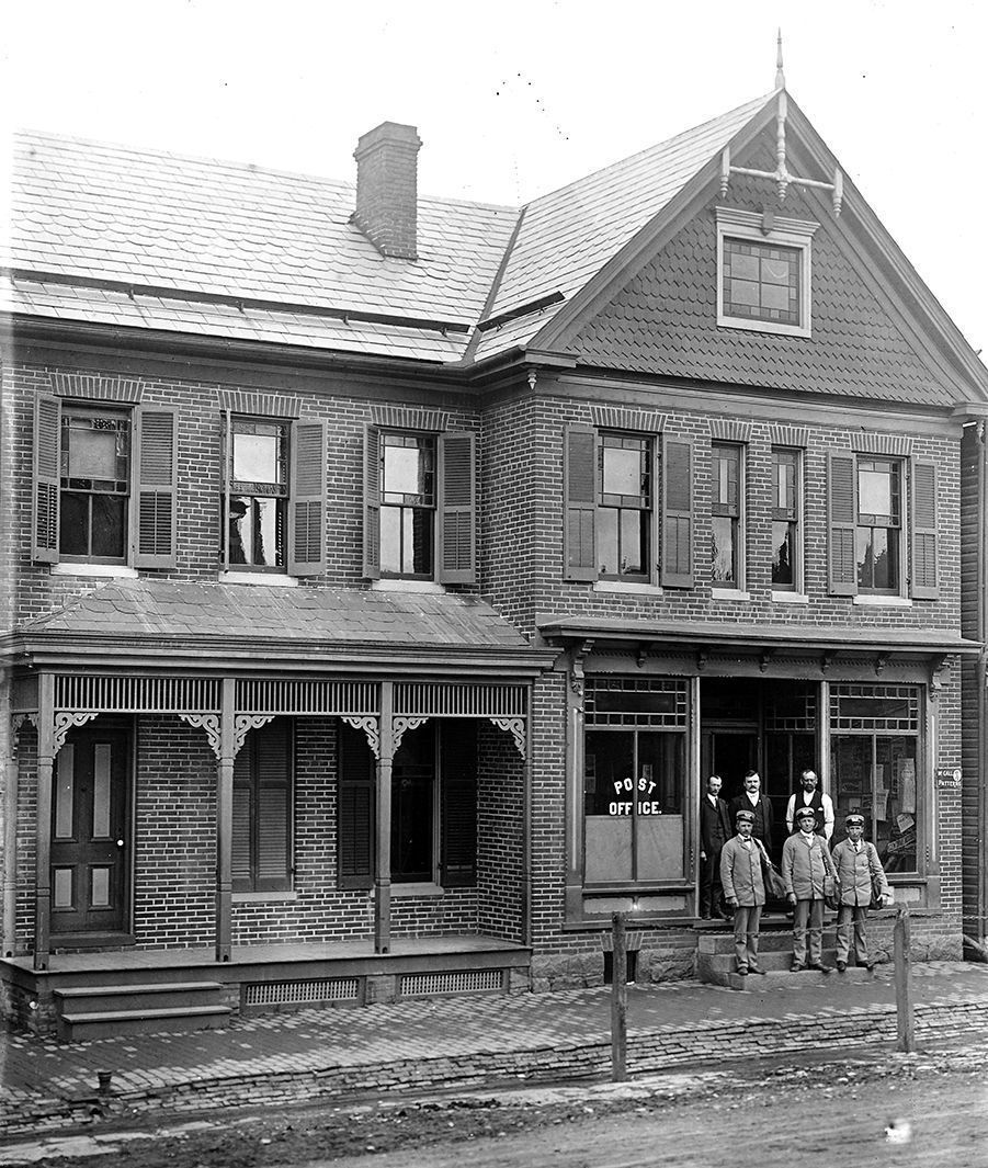 Print, photographic. Taneytown Post Office, 1902. Two-story brick post office; "Post Office" is painted on the proper left window of the store front, and a square window decorates the gable of the building. Standing on steps, top row, viewing left to right - Stanley Reaver, postmaster; Arthur Combs, assistand postmaster; John Yingling, carrier. Bottom row, viewing left to right - mail carriers Harry Baumgardner; Charles Baumgardner; Kurg Eyler. Copy print, produced, c. 1975. Original photographer: Ed Zepp. Process: Glossy Silver Gelatin DOP. 10" x 8"Acquisition