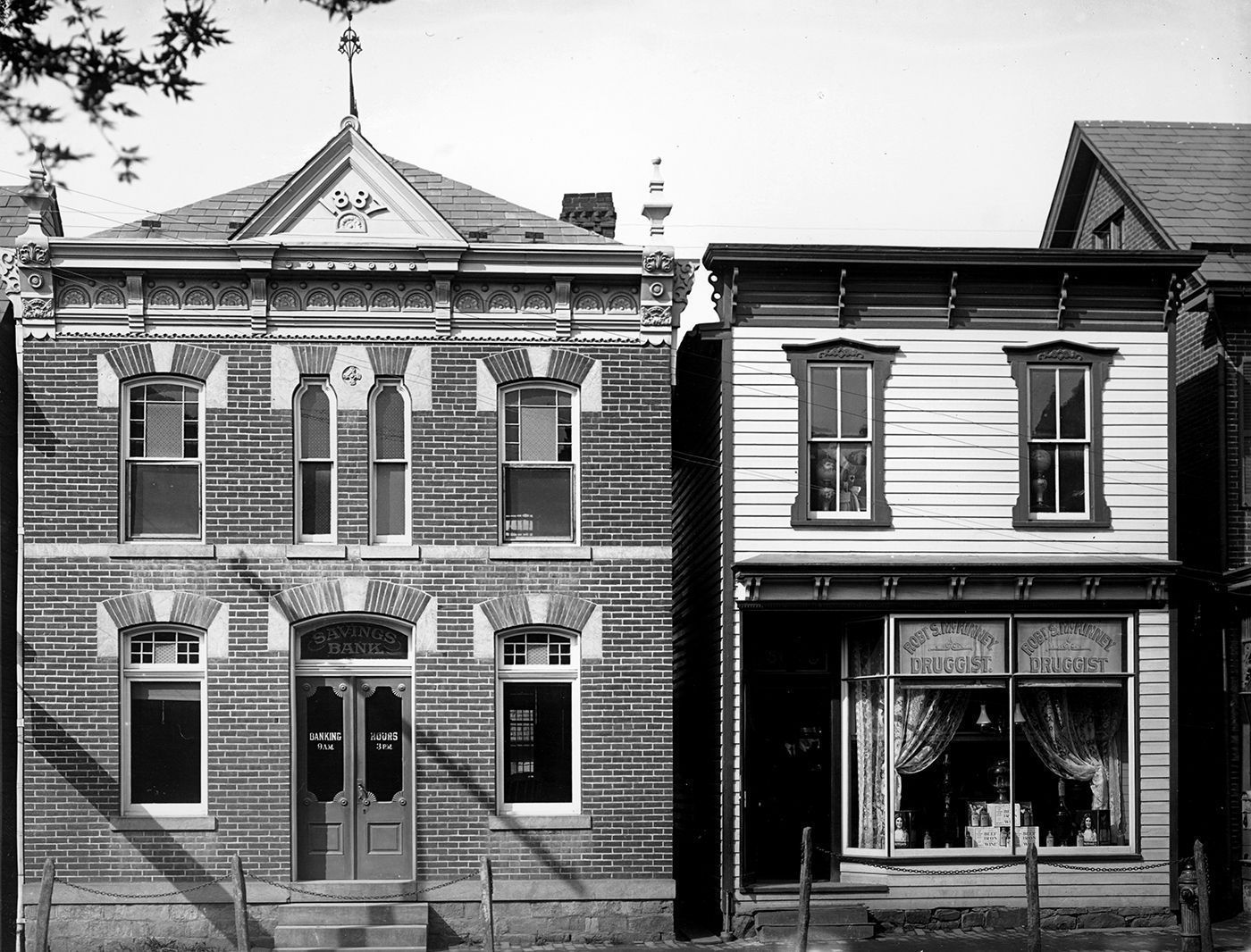 Print, photographic. Taneytown Savings Bank and adjacent Robert S. McKinney, Druggist, c. 1900. Copy print, produced, c. 1975. Original photographer: Ed Zepp. Process: Glossy Silver Gelatin Developing Out Paper. 8" x 10"Acquisition