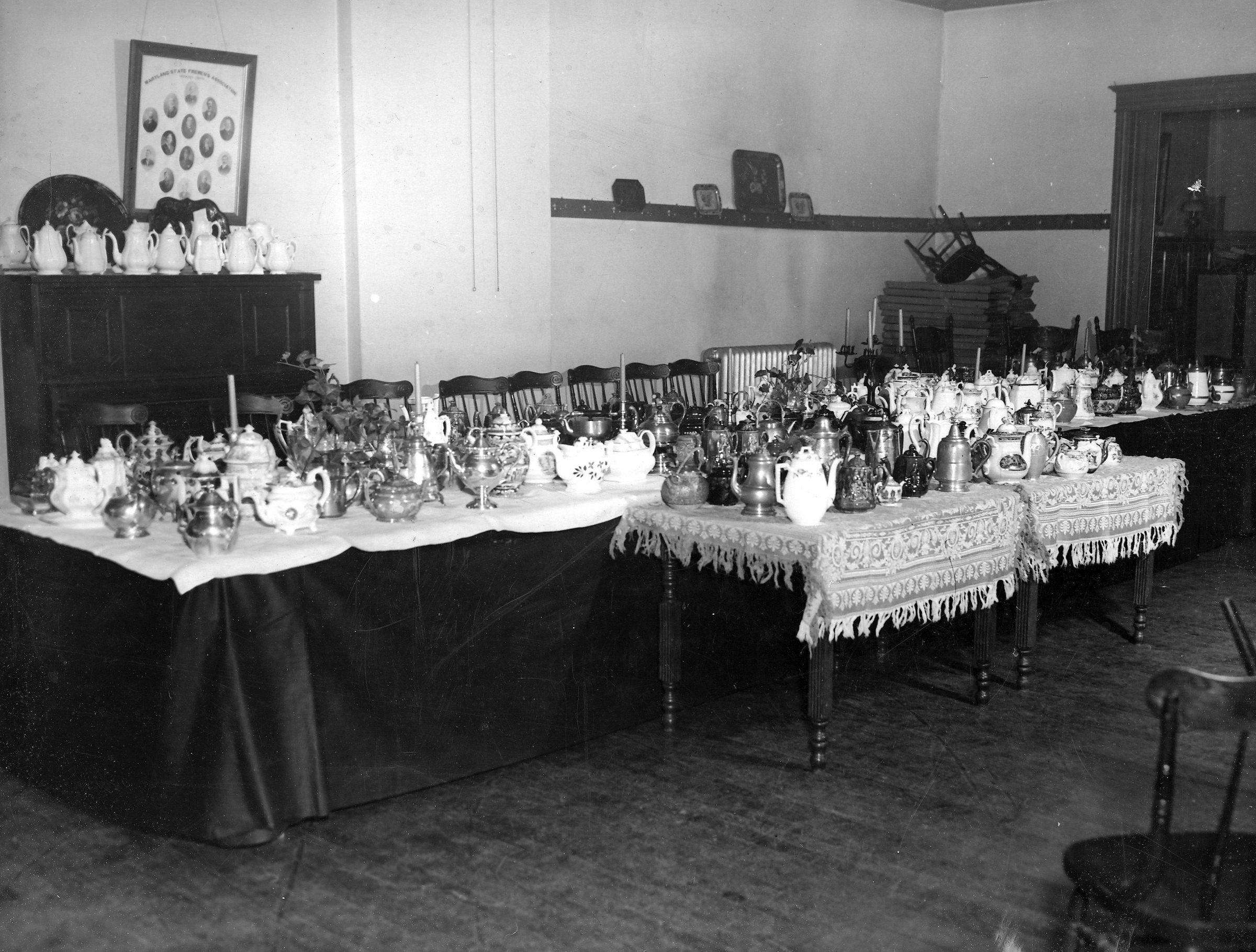 Black and white photograph of a teapot exhibit in Taneytown, MD on January 18th 1946. The photograph features various tables covered with assorted teapots. Chairs line the back most tables, and behind them is a fireplace mantle with yet another row of white teapots. The photograph is mounted and matted with a marbled cream matboard with "Westminster Studio, Westminster, MD" stamped in the lower proper right corner. The photographs overall measurements are 11.0"x 13.0".The image size is 7.5"x 9.5".