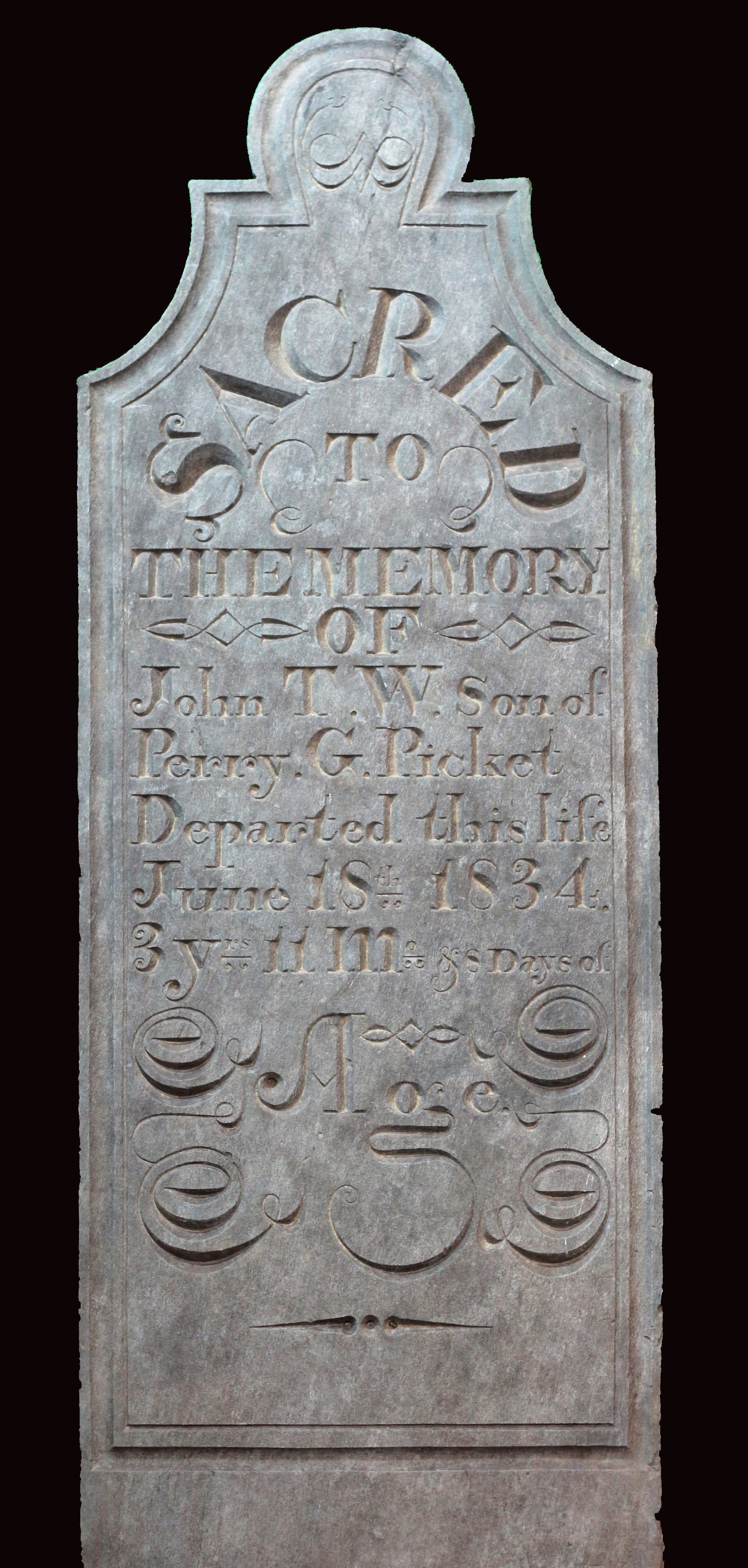 Tombstone. Carved from "Sam’s Creek" metabasalt; 54.5"h x 16"w x 11.25"d. Inscribed "SACRED TO THE MEMORY OF John T.W. Son of Perry G. Picket Departed this life June 18th 1834 3 Yrs 11 Mo & 8 Days of Age". Body has straight sides and trefoil top; border of double lines incised around edge; ornate script lettering.Acquisition