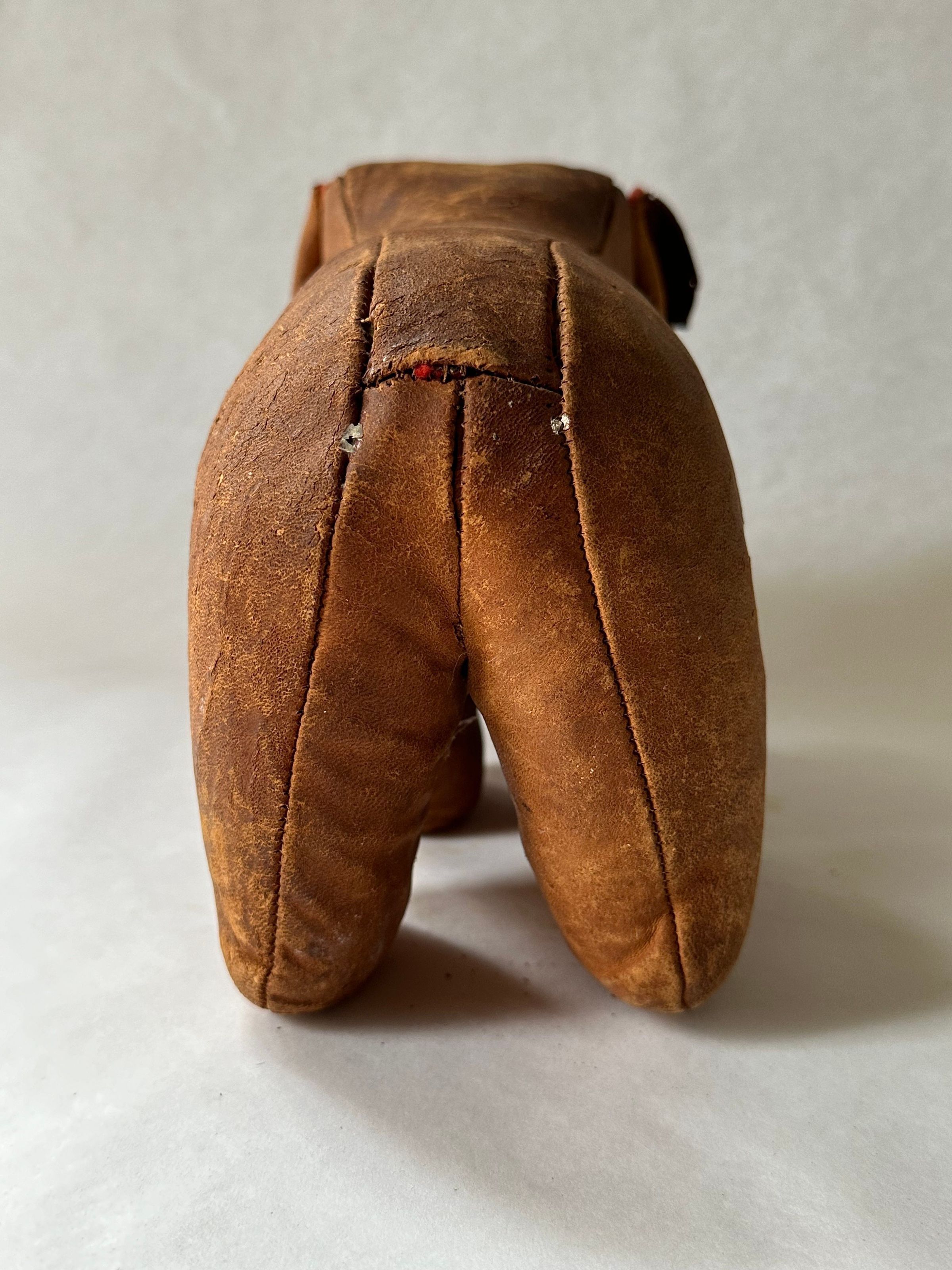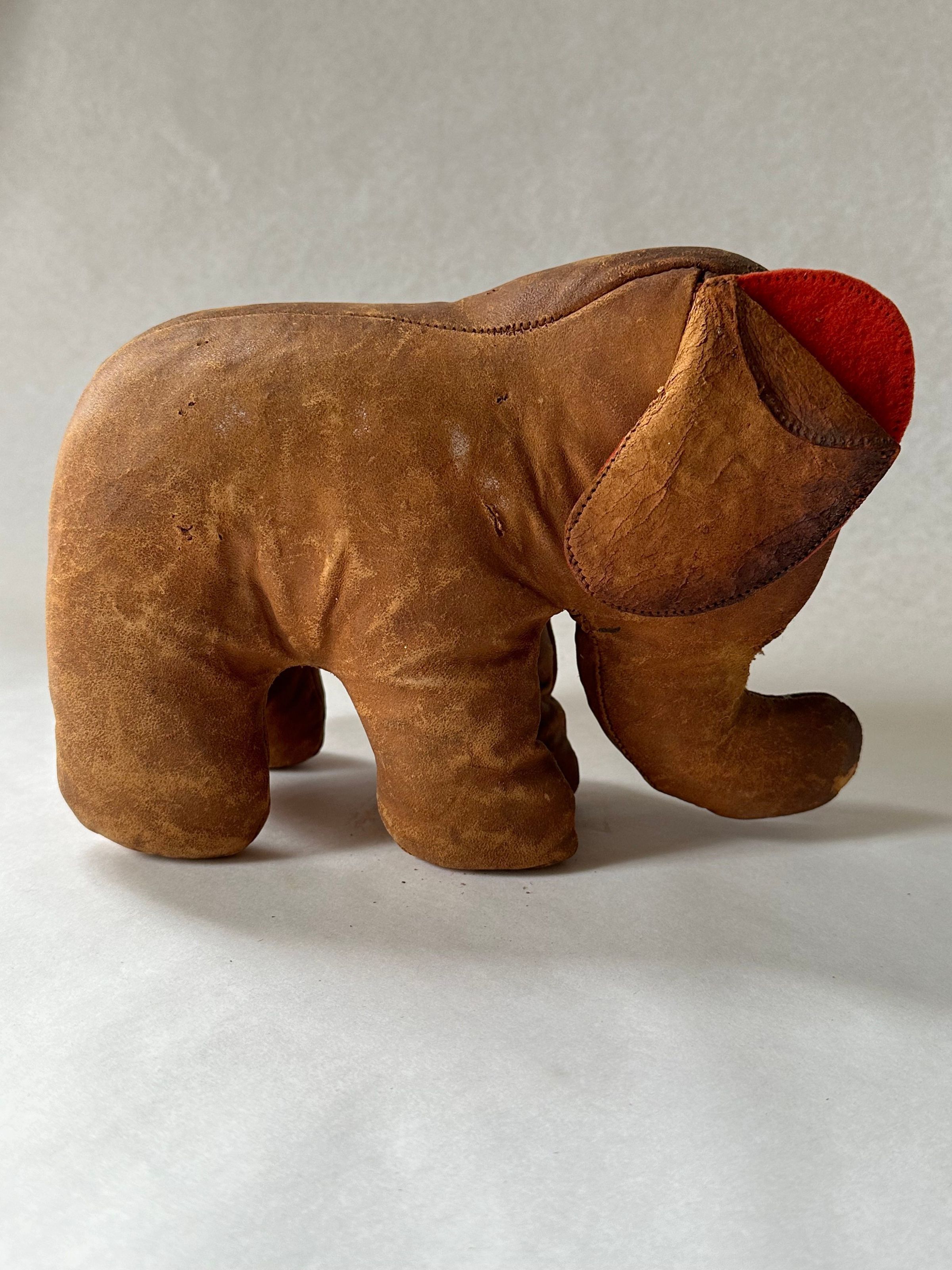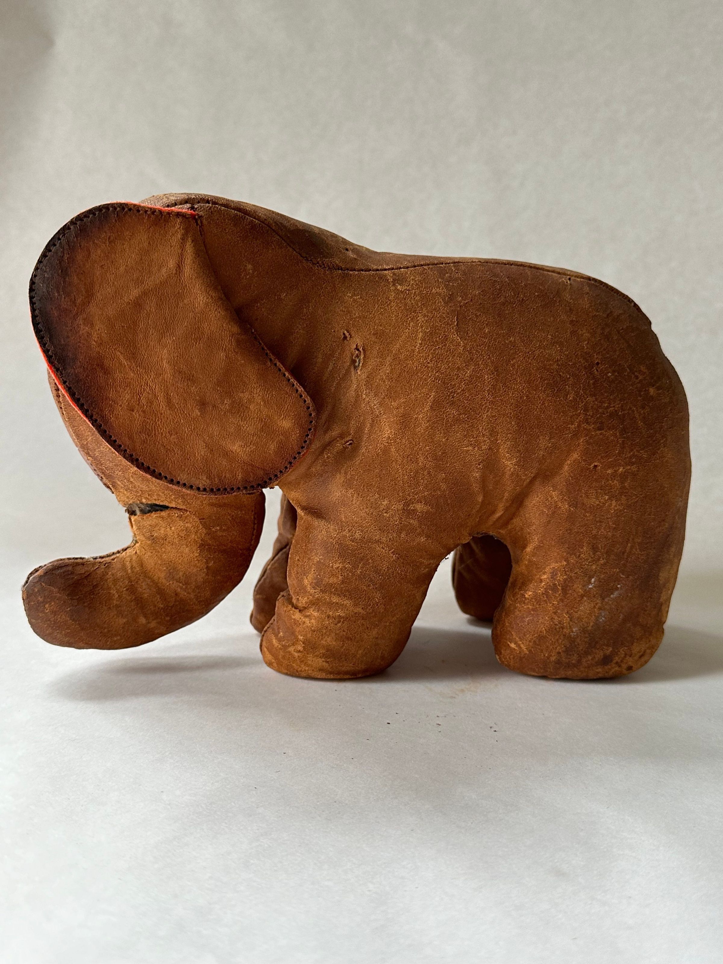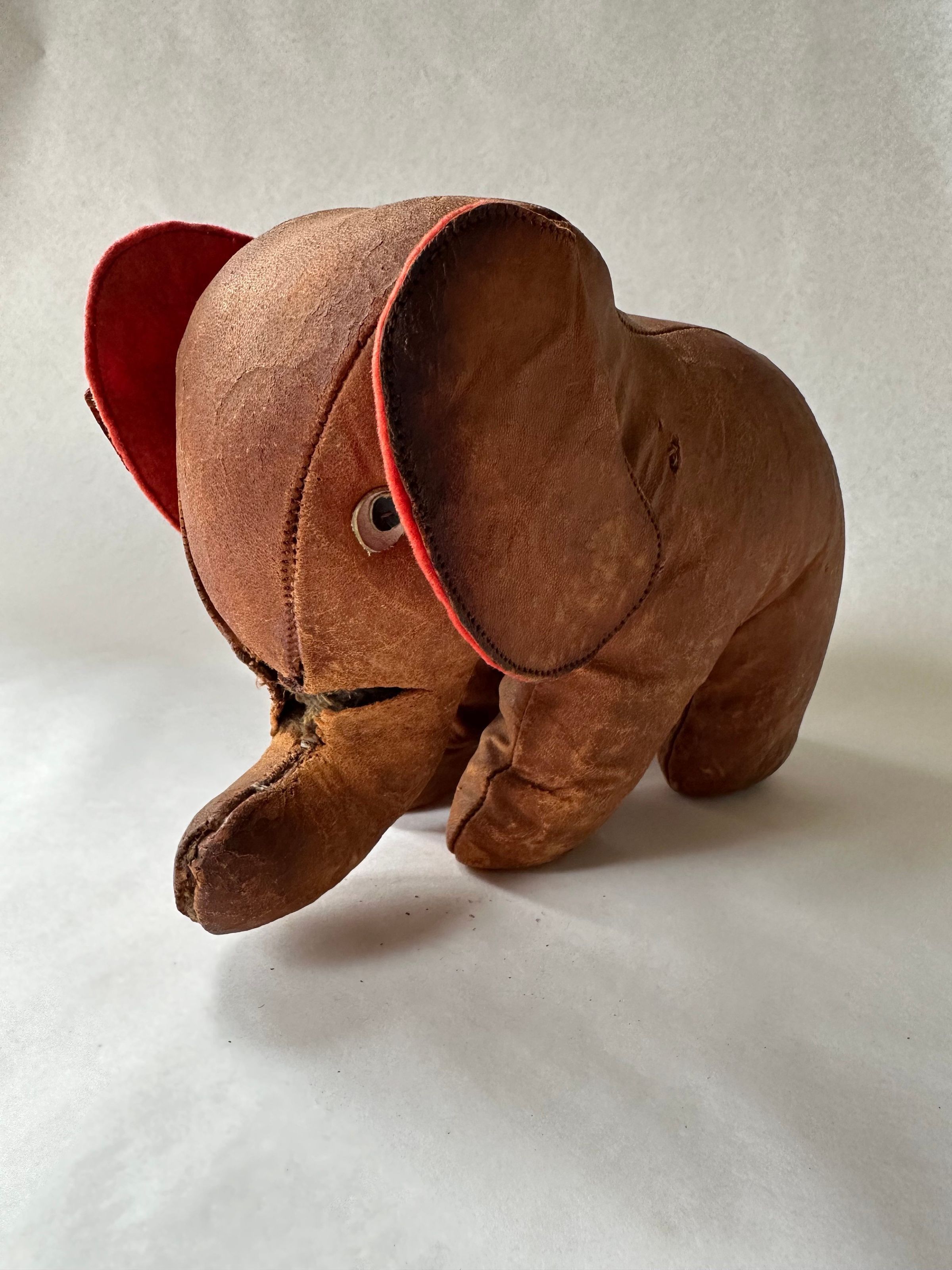 An elephant toy made of leather with a short trunk and two ears, lined in red wool. Their white and black leather eyes are sewn to their head. It stands on four legs. The body and legs are stuffed with an unknown material.