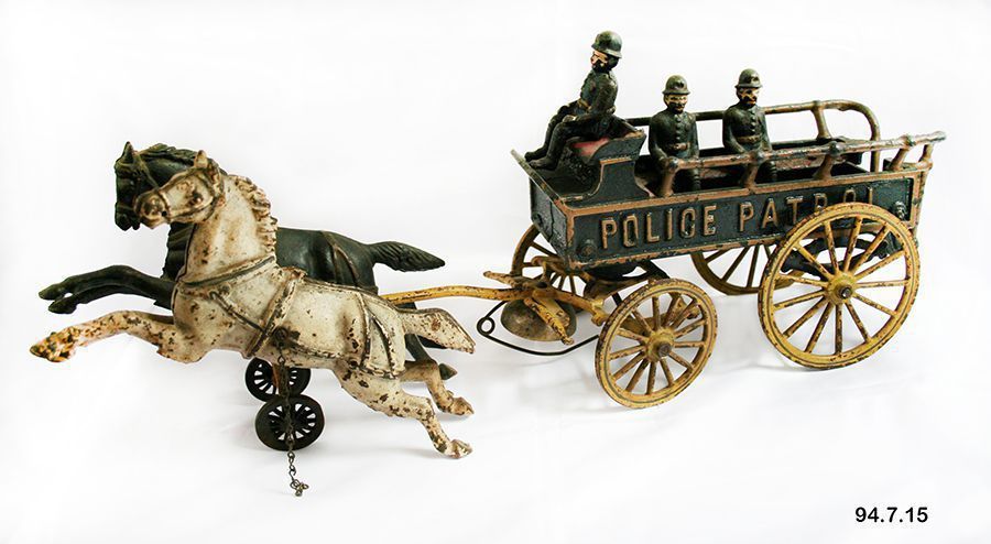 Toy, bell. A-E. Cast iron police wagon, horses, and policeman toy, with all elements in place, 8.5" x 18" x 4.5". Wagon is rectangular with box in front for driver. Rails painted brown to resemble brass surround the top of the wagon. The body is painted black with the cast words on the side "POLICE PATROL". Inside the wagon is a bench cast to look padded and painted red. There are six holes along the bench in which pegged policeman figures sit. The box also has a hole and corresponding pegged policeman figure. Three cast figures have been retained. They were cast with rounded helmets/hats and uniforms with a single row of buttons in front. The uniform is painted blue, ornamented with light brown for metallic elements, and facial features are also painted. A brass bell is mounted underneath the front wheels of the wagon. Two hobby horses are attached at the front, suspended above two small wheels. One is painted black, the other white, and both are ornamented with light brown to simulate leather and brass fittings. No makers marks are apparent. c. 1890. A: horses with tongue and pair of wheels. B: wagon. C-E: figures.Acquisition