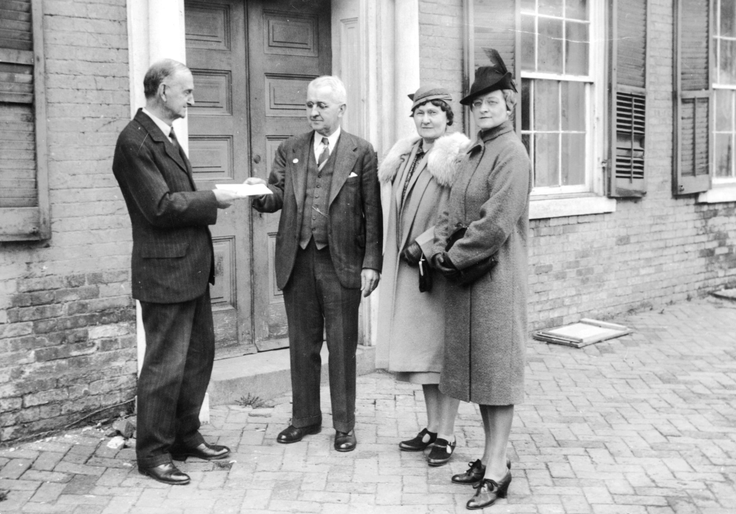 Color slide of State Senator J. David Baile, John Cunningham (Carroll County Bank), Mary Clemson, Irene Shunk; trustees receiving deed to the Shellman House, 1939.Acquisition