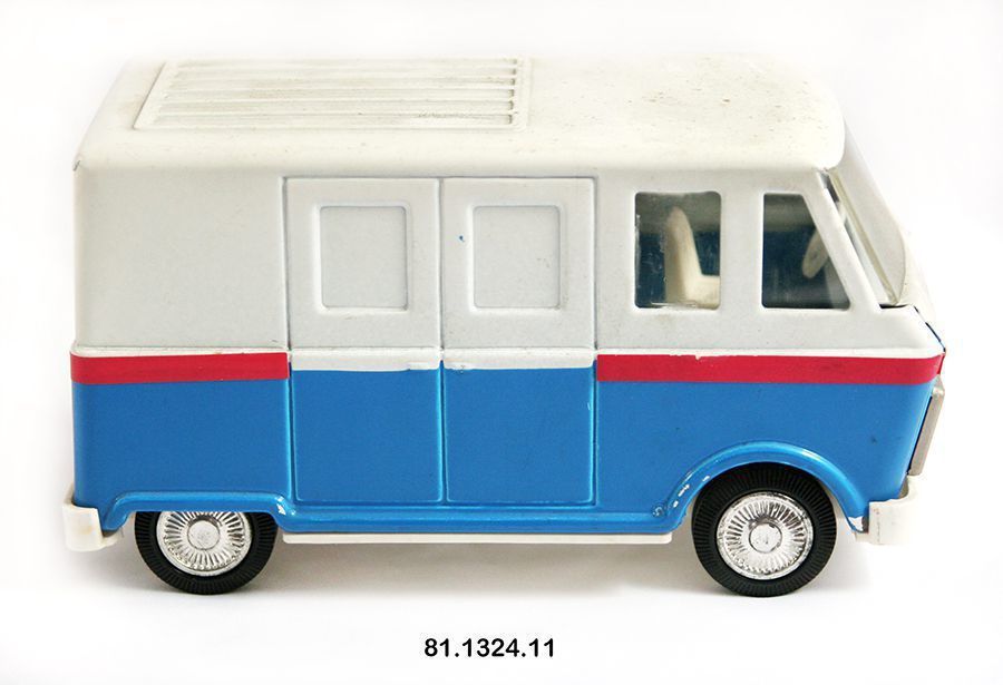 Truck, mail. Toy. 3.25"h x 3"w x 6.25"d. Postal service "sit or stand" van. Metal, van, red/white/blue, "US MAIL" stickers on side. On bottom: "CRAGSTAN MADE IN JAPAN."Acquisition
