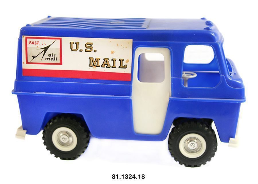 Truck, mail. Toy. Blue plastic. Paper label glued on side "Fast-air mail. US Mail." Moveable white sliding doors. 7.75"h x 6"w x 12.5"d.Acquisition