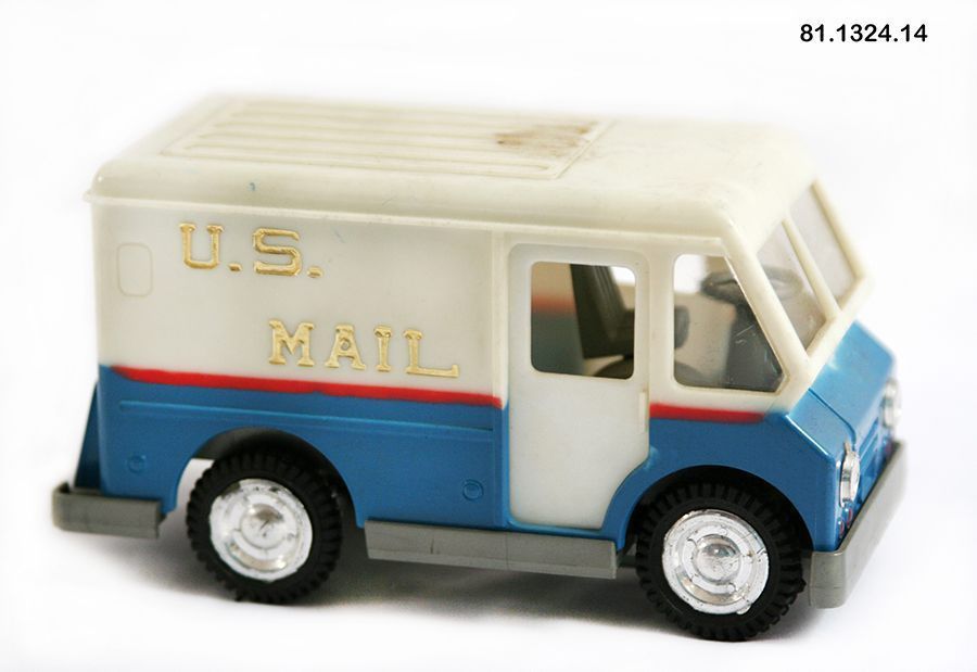 Truck, mail. Toy. Postal service "sit or stand" van. Plastic van, red/white/blue, "US MAIL" in gold on sides. Doors slide open. On bottom: "ZEE NO. 2025. MADE IN HONG KONG." 2.5"h x 2.25"w x 4.75"d.Acquisition