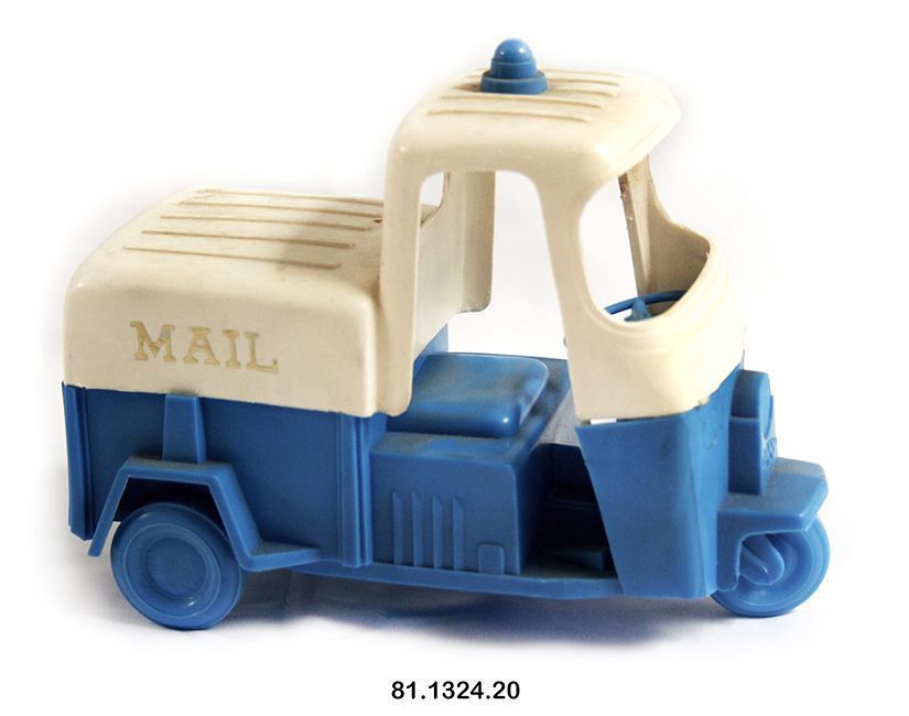 Truck, mail. Toy. Postal service "mailster." Plastic, blue and white, three wheeled truck. Gold lettering on side: "MAIL." Raised lettering on back: "GAY" 5.75"h x 7.25"w x 3.75"d.Acquisition