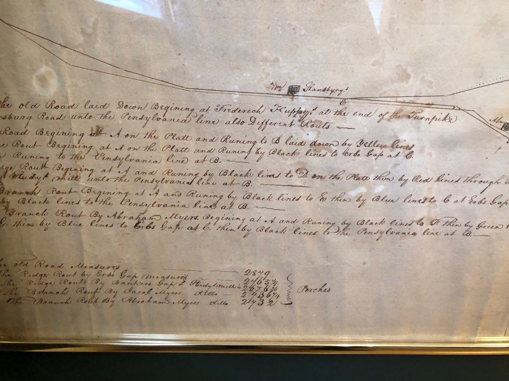 Map, plat. A plat map depicting the land, rivers and notable routes in the upper Carroll County and Pennsylvania area hand drawn on several connected sheets of parchment. Map includes measurements for several roads, locations of local mills, and branching water trails intersecting Pipe Creek. Signed in lower right corner “James Baker”.