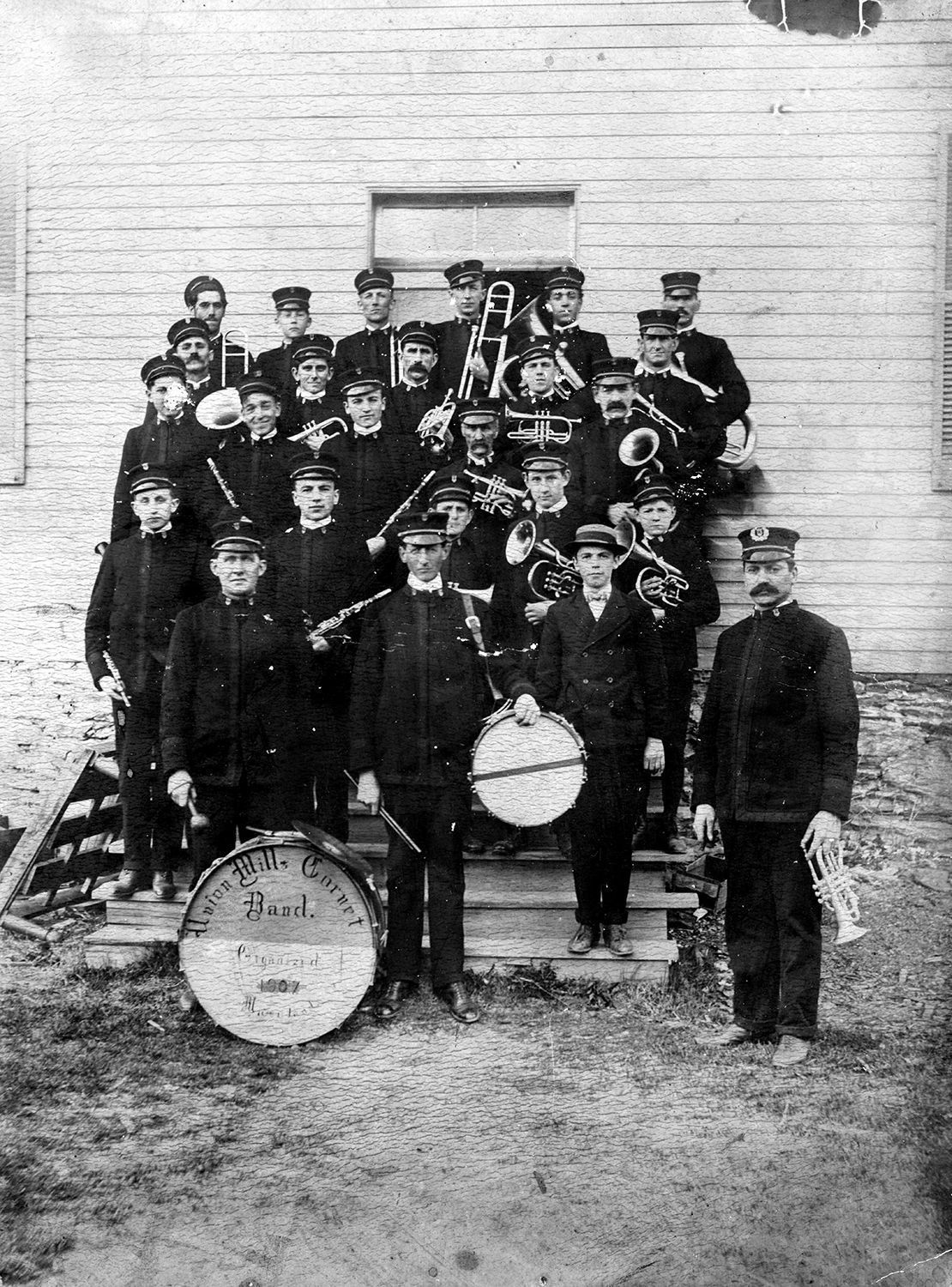 Print, photographic. Union Mills Cornet Band, 1907. B/W photograph mounted on a black mat. Group of 25 men and boys standing on steps leading up to a clapboard building. The men and boys are wearing band uniforms and holding a variety of instruments including flutes, drums, clarinets, french horns, trombones, trumpets, etc. There is a drum sitting in front of the group that reads "Union Mills Cornet Band Organized 1907 Maryland". Mounted, off-center, on black board. On back in black ink "O.M. Troxall & Mother - 475". In blue ink "Union Mills Band - 1907". In pencil "Union Mills Band 1907". Overall size 10.875" x 9.125"; photo 8.625" x 6.5".Acquisition