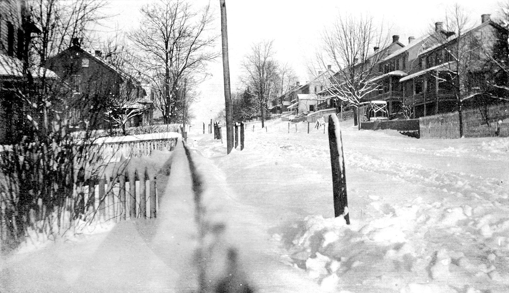 Black and white photograph of a winter street scene on Littlestown Pike in Union Mills, MD. The photograph features a shot taken along a snow-covered fence and shows Littlestown Pike completely covered with snow. The photograph is mounted on gray matboard and has an overall measurement of 4.5"x 7.5".
