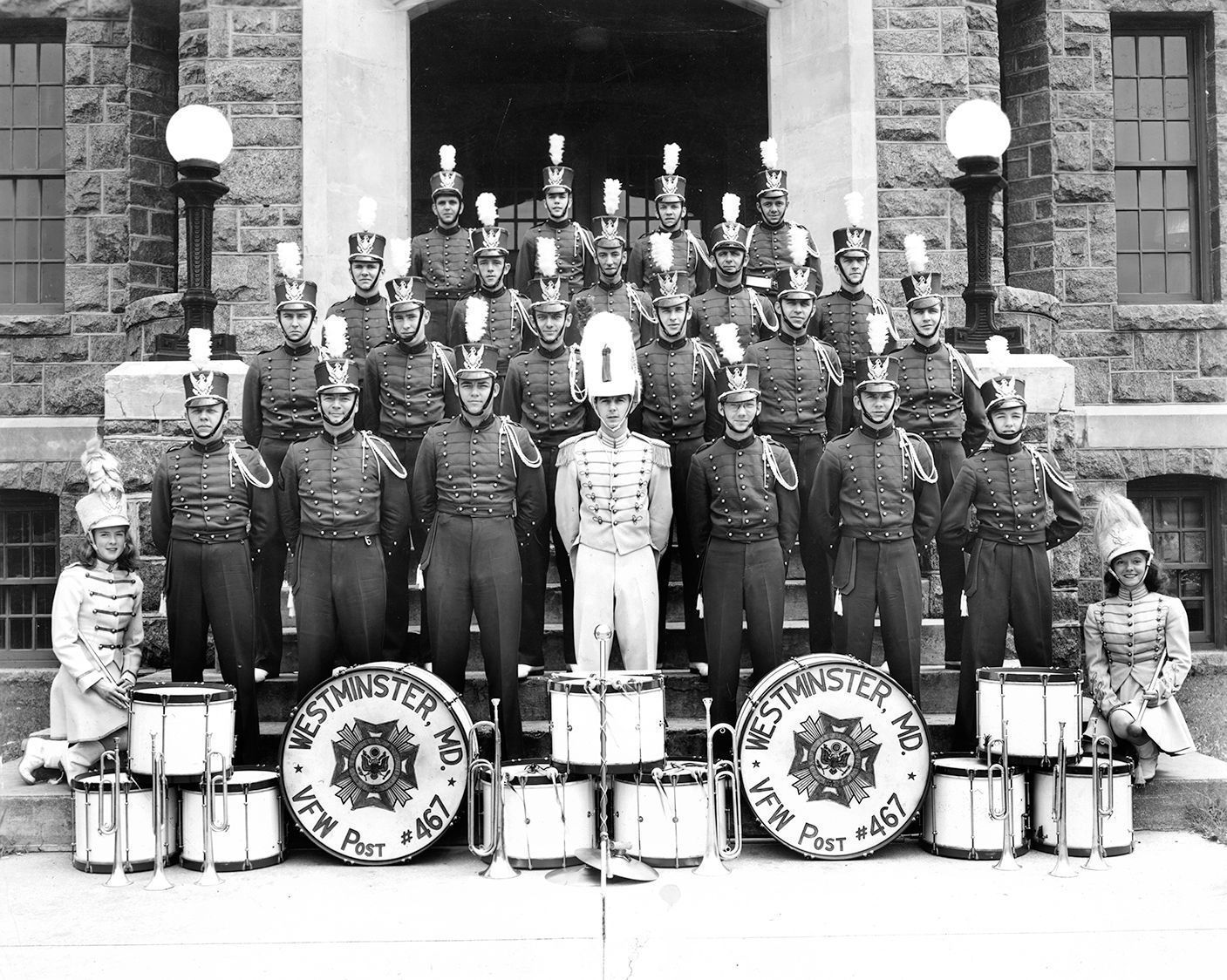 Print, photographic. B/W silver gelatin print, 8" x 10". Shows the VFW Drum Corps, Post #467, on the steps of the Armory in Westminster, 1949. Written on back is "VFW Drum Corp 1949". Identified, 15 November 1999, by Paul Wardenfelt as: First row: Doris Swartzbaugh, Dan Englar, Jim Turfle, Dick Howm, Bob Bowers, Bob Stansburg, Geo. Zihn, Lee Manger, Louis Guild. 2nd row: Bob Davis, Zolli Koffer, Bob Whitehurst, Dick Eckenrode, Russ Martin, Joe Evans. 3rd row: Bob Melown, Tom Holmes, Fred Crumpacker, Karl Byers, Booker Miller.Acquisition