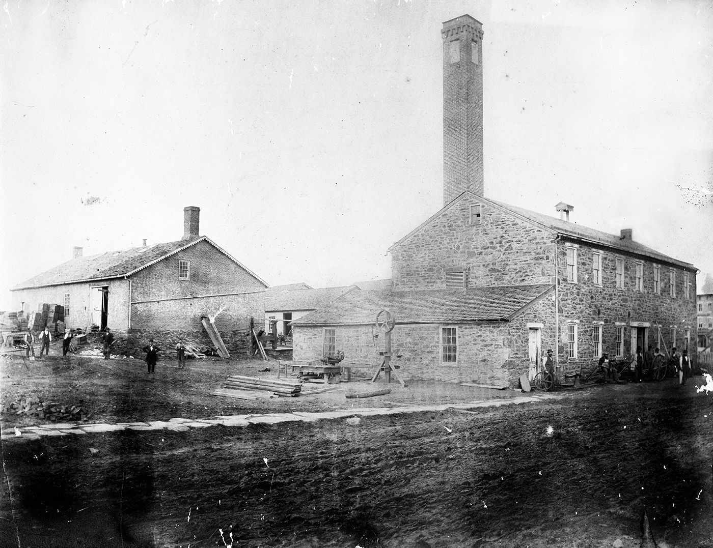 Black and white photograph of Wagner Manufacturing Co. on 14-16 Liberty St. in Westminster. The photograph displays two large buildings (the building on the proper left side of the photograph is made of brick, the building on the proper right is made of stone). Various men stand around the outside of both buildings, most looking toward the camera. A large smoke stack rises from the stone building. The photograph is mounted on a thick tag board, and the overall measurements are 10.75"x 14.0".