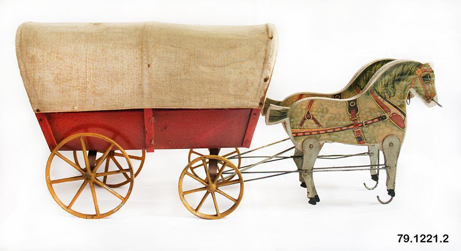 Wagon, covered. Toy. Red wagon; bed and sides are metal, ends are wood; four metal wheels, painted bright yellow; unbleached cotton stretched over 3 wood ribs forms top. At front is a pair of horses; each is flat, wood, has a color lithograph glued on each side; lithographs are of a dappled horse with red and black harness; red swastika on harness. Legs of each horse are sheet metal, attached at knee to metal rod which runs back and attaches to front axle of wagon. When wagon is rolled, horses' legs move. 8.5"h x 5.5"w x 19"d. C. 1915.Acquisition