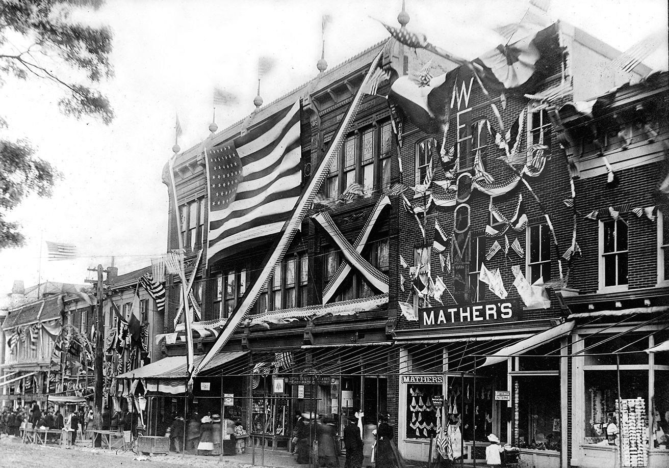 Print, photographic. Wantz and Mather buildings, East Main St., Westminster, MD. Buildings decorated with flags and bunting. Mitchell's Art Studio, Westminster, MD. 4.75" x 6.75", mounted.Acquisition