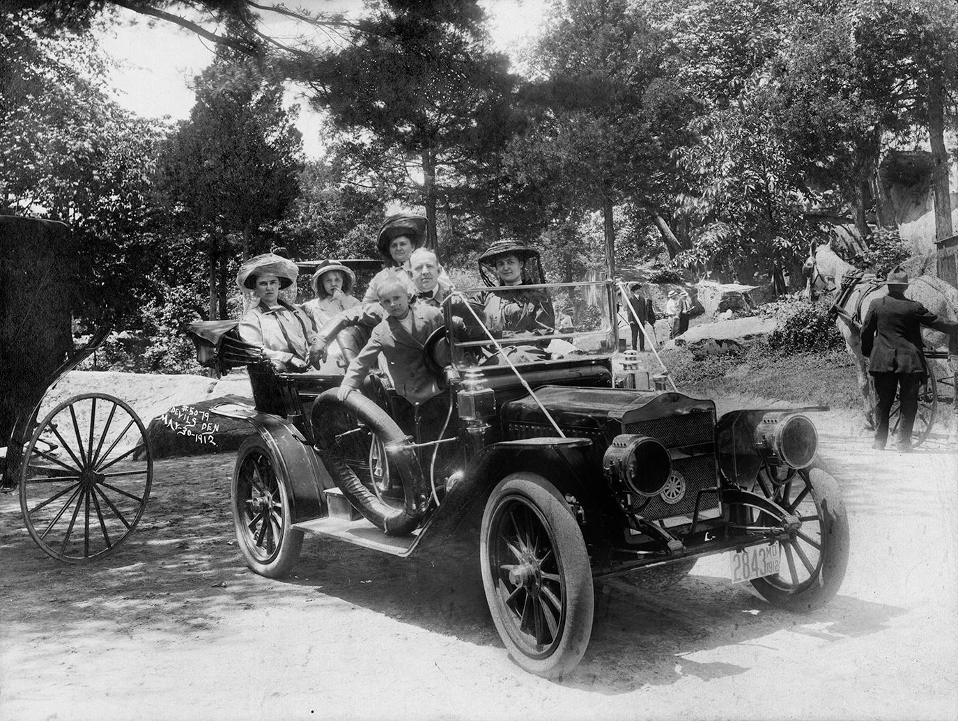 Print, photographic. B/W photograph of the Wantz family at Gettysburg, Pa., 1912. Shows the family in their car at Devil's Den on the battlefield. Printed on the front of the photograph, "#5079 Devils Den May 30 1912". Hanwritten on back: "James Pearre Wantz Sr., James Pearre Wantz Jr 3yrs, Dana Price Robertsons College Classmate at W.M.C, Carrie Rineheart Wantz, Caroline Rineheart Wantz 5 yrs, May Whaley- College Classmate at W.M.C." Mounted on black mat board. Board is marked "Mumper Gettysburg, Pa." Overall size 10" x 12"; image size is 7" x 9.25"Acquisition