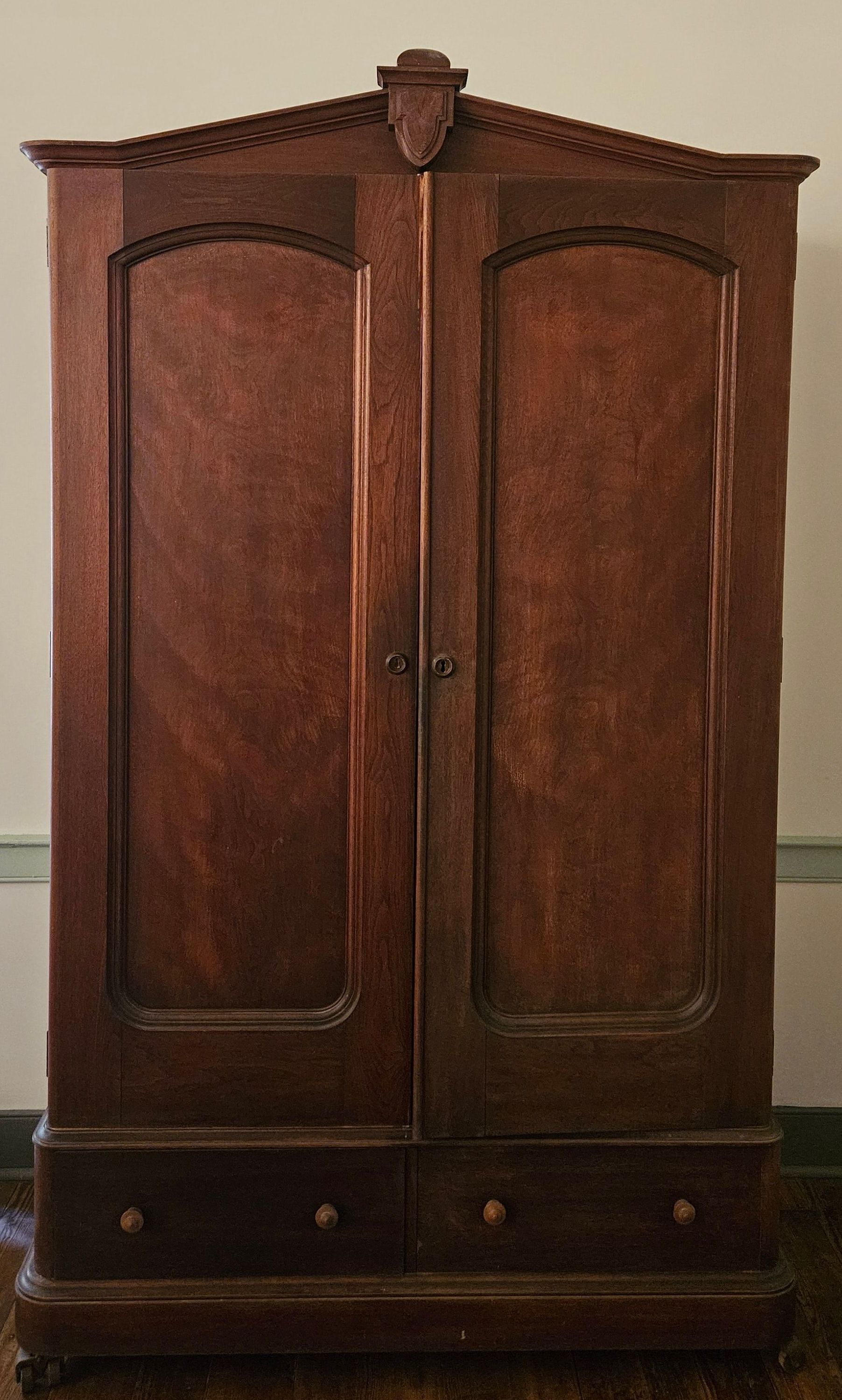 Angled top with raised shield-like cresting, molding around top edge. Two large rectangular doors with recessed panels (rounded top and corners, molding around edge), round raised escutcheon on each door. Inside is divided into two sections with a vertical partition in center, brass hooks. Two drawers across bottom with rounded outside edge, each has a pair of pointed round drawer pulls. Plain skirt with rounded corners, molding on top edge. 1870s. 86"h x 52"w x 22.5"d.