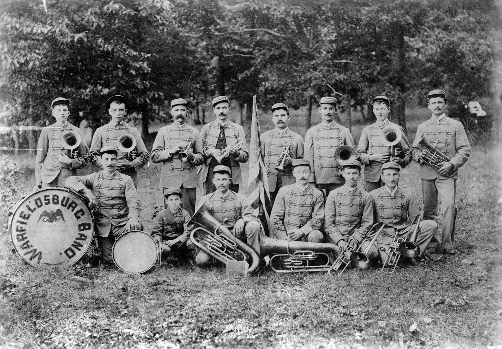 Print, photographic. B/W silver gelatin print, 5" x 7". Shows the Warfieldsburg Band in front of Morelock school, 1890. Identified on back as "1st row, left to right: William Toutz, Edward Summers, Howard Bower, Vernon Barnes, John Buckingham, John Foutz. 2nd row, left to right: Harry Summers, Clayton Beggs, John Arbaugh, Bailey Morelock, Isaace Buckingham, Clarence Lantz, Noah Arbaugh, Charles Lantz." Written on back is "Warfieldsburg Band - 1890. Taken at Morelock Schoolhouse."Acquisition