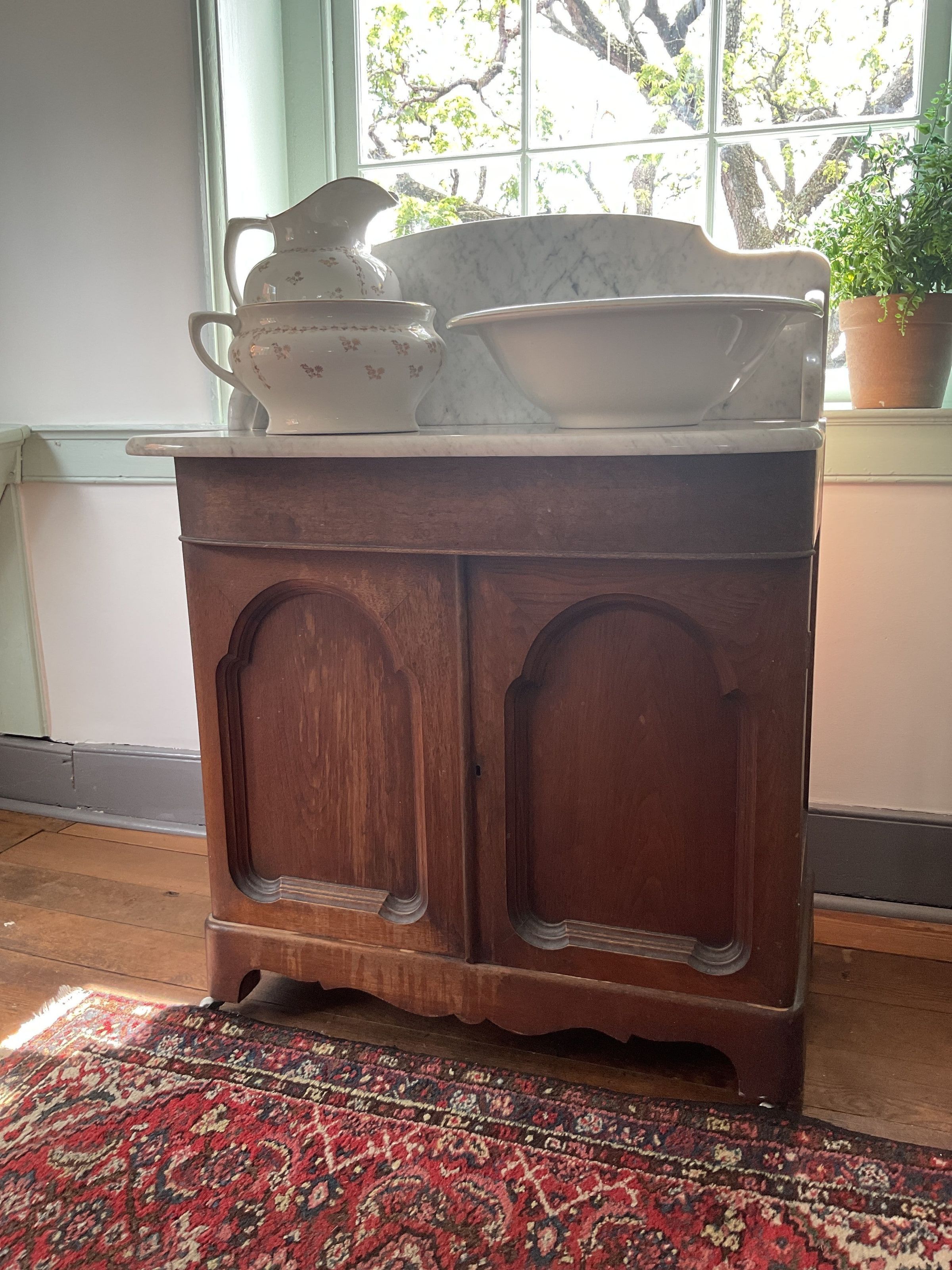 Washstand. Marble top with rounded front corners, tall curved top backsplash with bracket side pieces. Wood base, two doors with deeply recessed panels that have arched tops, keyhole on proper left door. Recessed panel sides, symmetrical scroll skirt, bracket feet, casters, one shelf inside. 39"h x 29.75"w x 17.5"d.