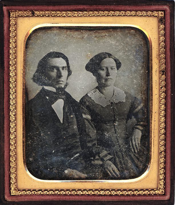 Daguerreotype. A 1/6 plate daguerreotype of Jacob J. Weaver, Sr. [14 January 1822 - 27 December 1895] and his wife, Beulah A. (Clarke) Weaver [10 July 1822 - 27 December 1898]. By an unknown photograph. C.1850. Middle-aged couple; man wearing a dark suit; woman's dress has lace collar and cuffs and trim just below shoulders. Plate mounted in the right panel of the folding case under an embossed copper mat, facing an embossed red velvet panel on the opposite side of the case. Embossed case exterior in a rococo-like design. 3.5" x 3" x .5"Acquisition