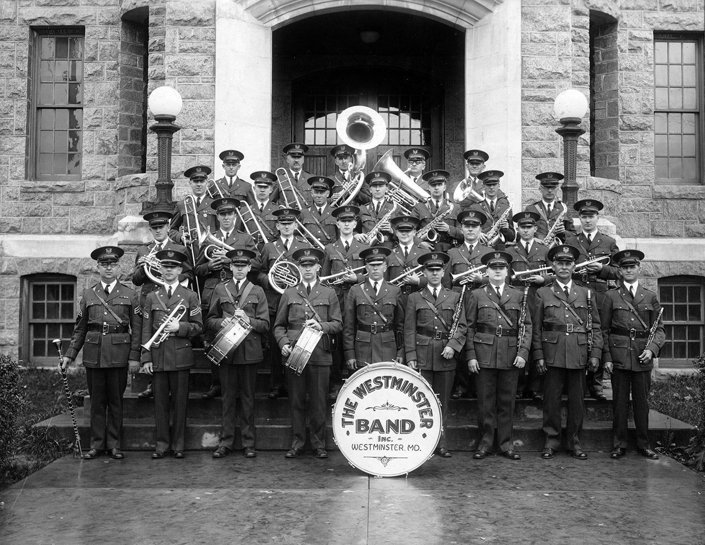 Print, photographic. Black and white photograph of the Westminster City Band outside the Armory Building in Westminster, MD of 1928. The photograph features the band dressed in uniform with their instruments. The photograph in mounted and matted with a brown mat, bearing the maker's mark in the bottom proper right corner "Wilson Studio, Westminster, MD". inscription is pasted onto the front bottom portion of the mat board with the Westminster City Band roster, "The Westminster City Band 1928 - Top Row - David Myers, Dixie Welsh, George P. Gunther, Charles Brown, Upton Myers/ 2nd Row- Glenn Miller, Warfield Babylon, Claude Myers, Russell Warner, Pearee Wantz Jr., Ned Shriver, Edward Knox/ 3rd Row - Roscoe Myers, Walter Arnold, Ralph Royer, George Fringer, Ephram Bowersox, William Lippy, Carr Robinson, Russell Miller/ 4th Row - Francis Keefer (Dr. Maj.), Donald Fowble( Dir.), Wilson Campbell, Louis Rice, Charles Grumbine, Orville Earhart, Eltinge Lambert, Clarence Lantz, Roy StrineThe overall size is 11.5" x 14". The image size is 7.625" x 9.675".Acquisition