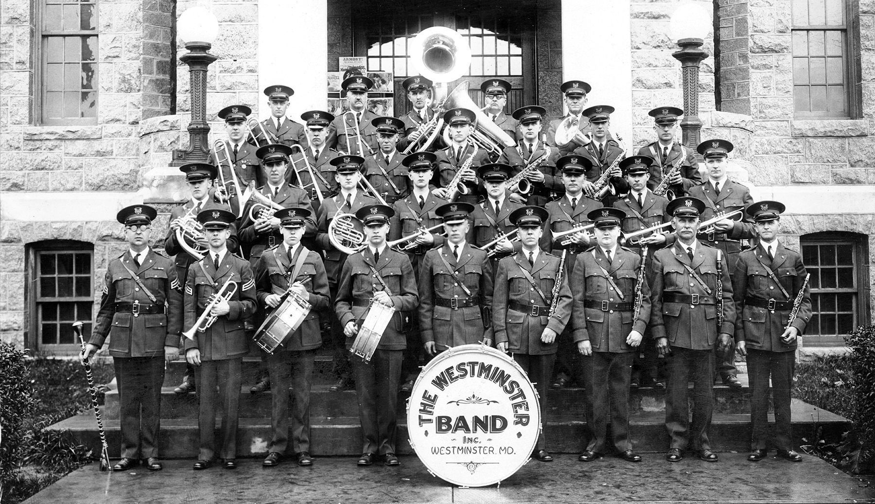 Print, photographic. B/W silver gelatin print, 5.5" x 9.5", show the Westminster Band on the steps of the Armory, Westminster, 1928Acquisition
