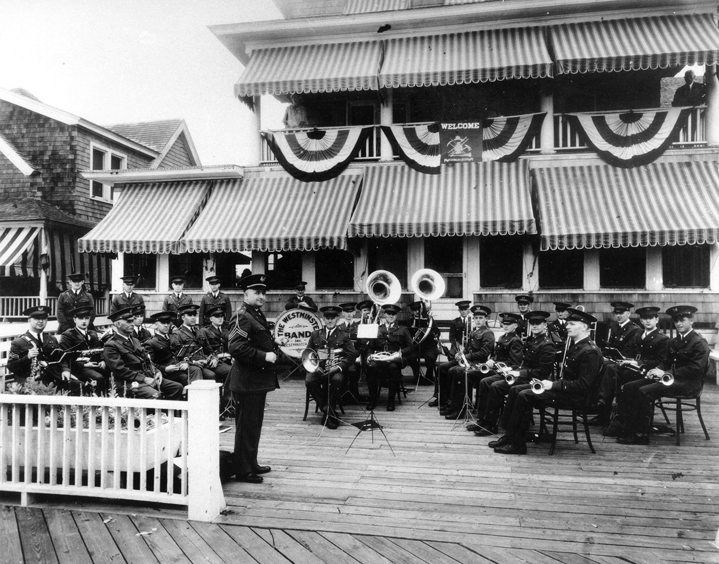 There is a piece of paper with this information typed on it "The Westminster Band in concert on the boardwalk in front of the Hastings Hotel, Ocean City, Maryland while attending the Md. State Fireman's Convention in June 1931. The Band won first prize of $100 for The Best Band in the Parade. The members are: standing from left: William Heagy, Warfield Babylon, Walter Grumbine, Louis Rice, Maurice Englar. Saxophone from left: (Drum Major) Francis Keefer, Pearre Wantz, Ed Yingling. Clarinets from left: Clarence Lantz, Orville Earhart, Les Wheeler, Harvey Lambert. Baritone: Upton Myers. Horns from right: Walter Bell, Lester Wimert. Trumpets from right: Russell Miller, P. Crowthers, Wilbur Blizzard, Louis Myers. Second row from right: Walter Myers, Jr., George Fringer. Trombones from right: Glenn Miller, Carroll Crawford, Elmer Richards, Dave Myers. Basses from right: Ralph Royer, George Gunther, John L. Schweigart (Director).