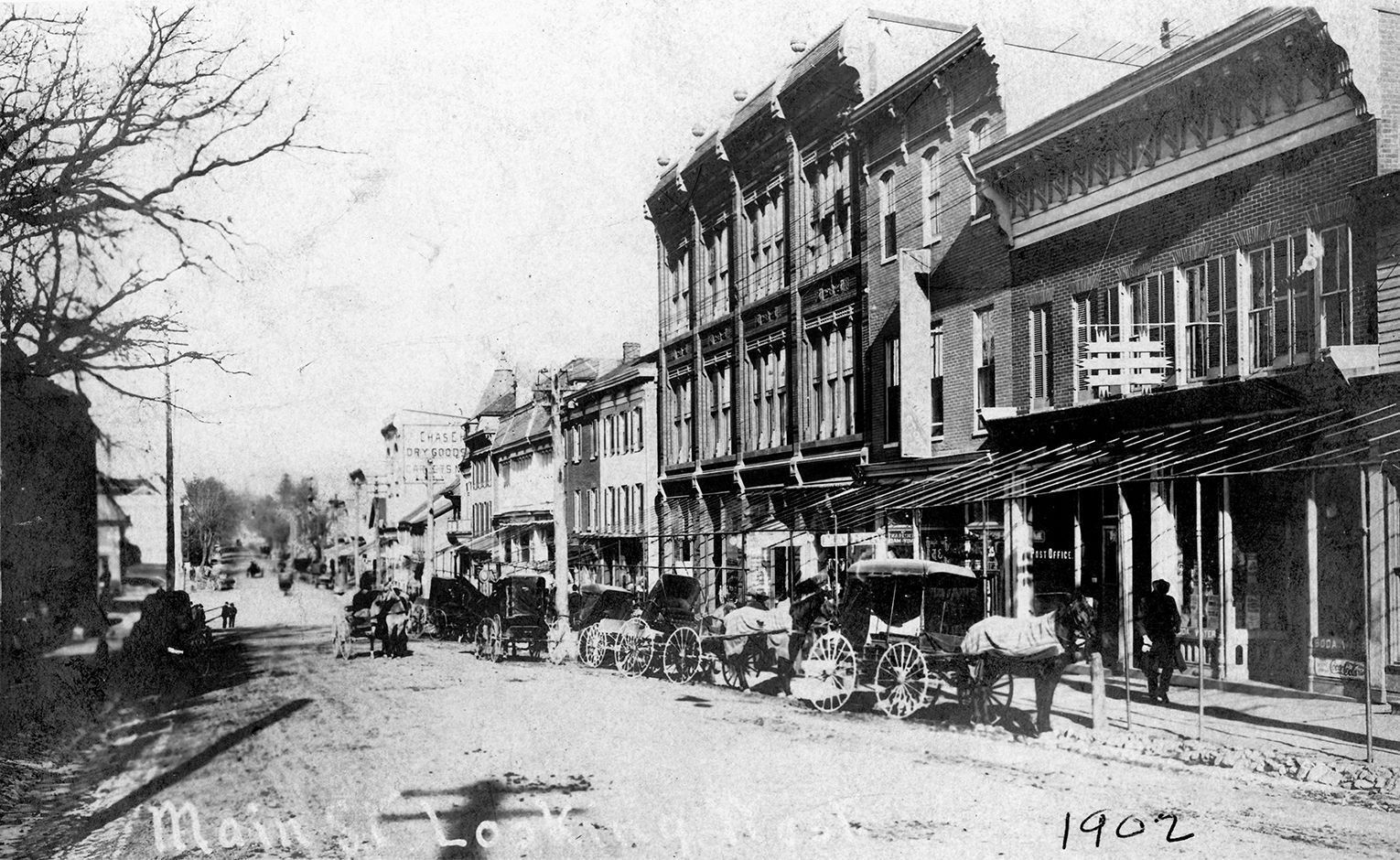 Black and white photograph showing East Main Street between Longwell and Railroad Avenues with many carriages parked along side of street. Dated 1902. Image size: 3.5" x 5.5".