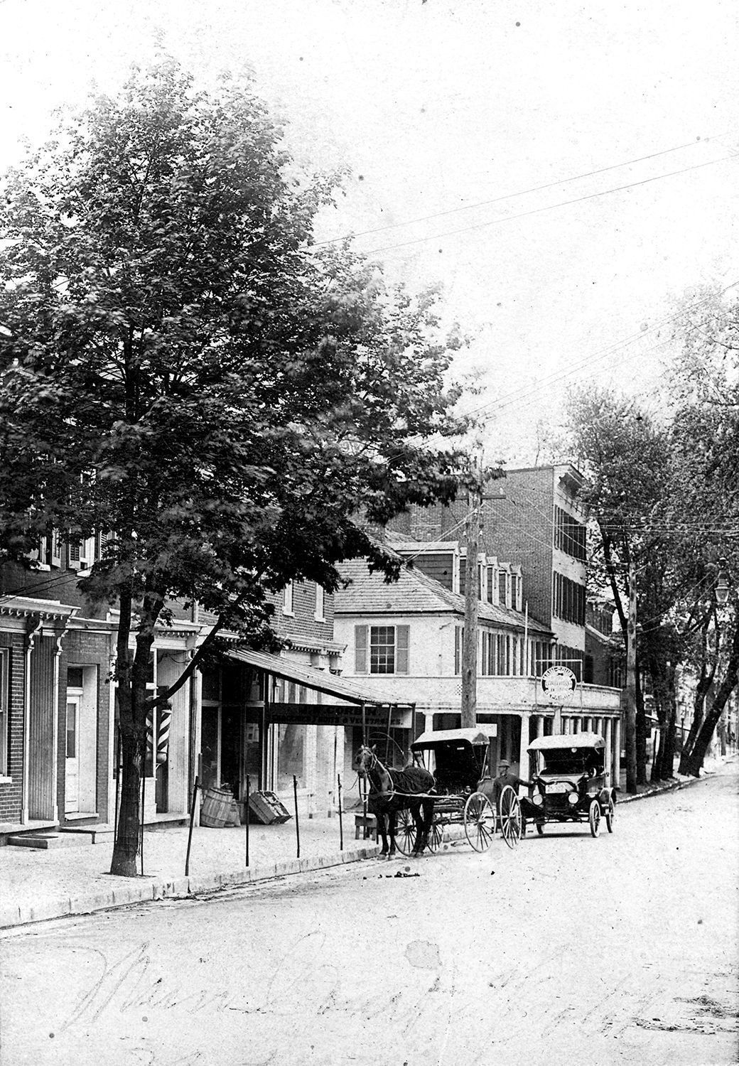 Unmatted black and white image of East Main Street, Westminster, at corner of Court St. and East Main Street with horse and buggy, early car and Main-Court Hotel. Undated. Image size: 5.0" x 3.75".