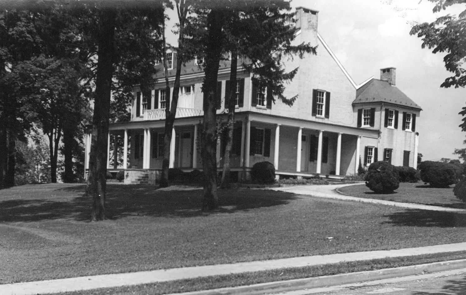 Black and white image of Westminster's City Hall, also known as Emeral Hill, the home of J. K. Longwell. View taken from Longwell Avenue showing front and side of building including addition on back. Includes sloping lawn around house and part of street. Dated Sept. 2, 1940. Image size: 4.5" x 6.5".