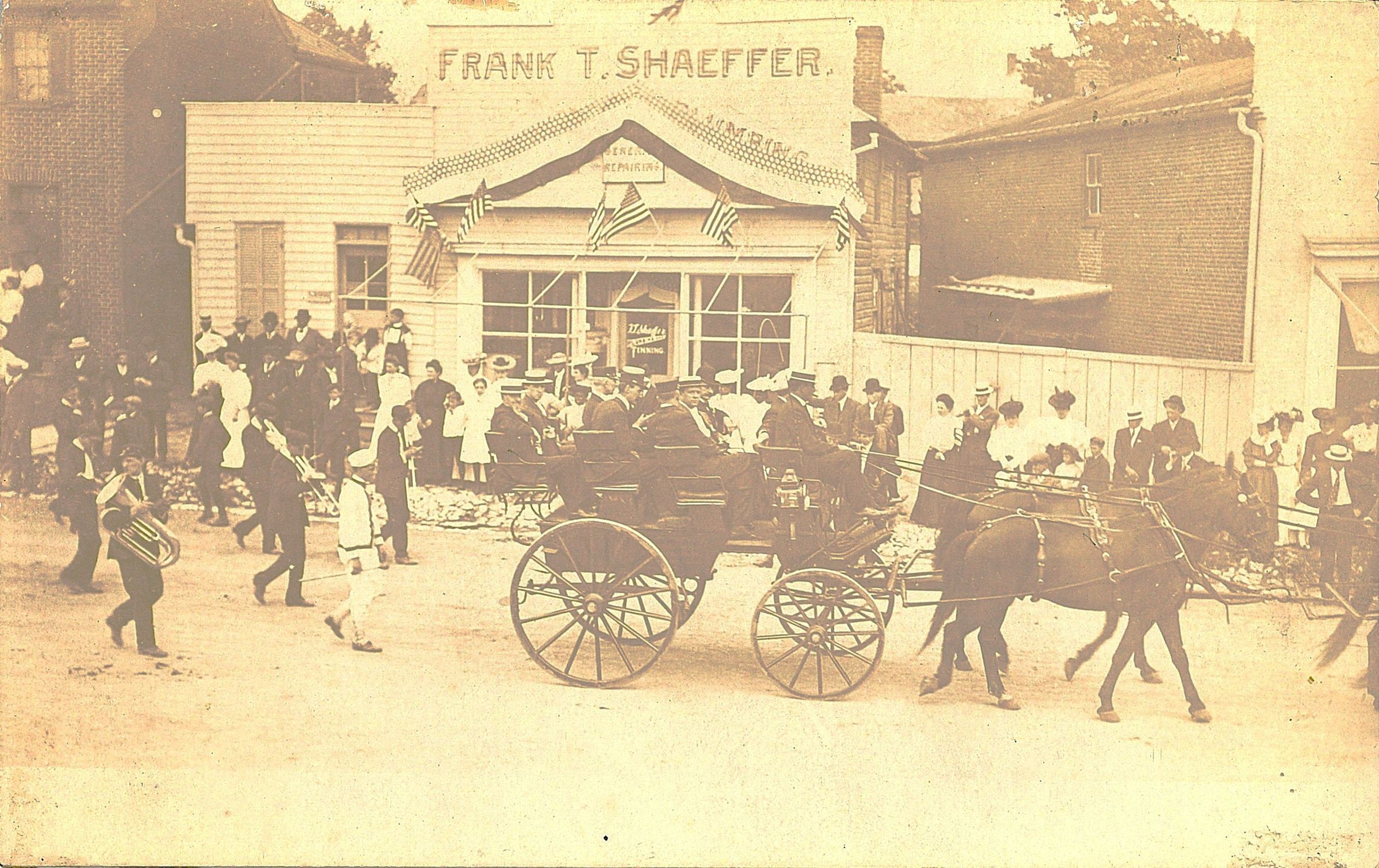 Postcard. Westminster Firemans Parade, Westminster, Horse-drawn wagon, 1905. B/W photo. The postcard shows a parade progressing down Main Street. There is a horse-drawn wagon at the center of the photo with four visible horses leading it. The wagon has four rows of seats, each filled with men. Behind the wagon is walking a band. The entire group is crossing in front of the "Frank T. Shaeffer Plumbing." There are small American flags and American flag bunting decorating the front of the store. People are gathered in large groups along the side of the road to watch the parade. 3.5" x 5.5"