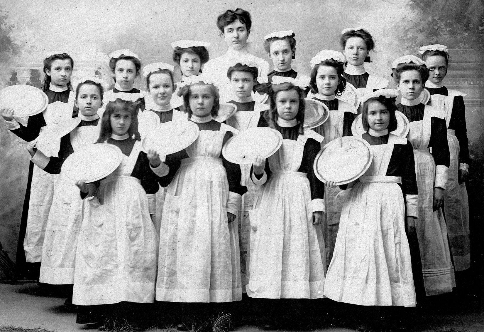 Print, photographic. B/W photo of students at Westminster High School, Center Street at Green Street. At the time the school held all grade levels. Shows "Waiter Drill". 14 girls, each in a dark dress, white apron and white cap; each one is holding a tray in their right hand. Teacher at back center. Mounted on dark gray board. Impressed below image "Mitchell's Art Gallery Westminster, Md." Names written on back; some are difficult to read. 1st row, left to right: Eloise Miller (Andrews); Anna Gehr (Twigg); Marie Shaw; Henrietta Roop (Twigg). 2nd row: Ella Shipley (Dutterer); unidentified; Isabel Roop (Hendrickson); Blanche Williamson. 3rd row: unidentified; Marguerite Stem; Ann Yingling (Kimmey?); Miss Lilllian Franklin; Mabel Armacost. Some names may be missing. Also written on back "Waiter Drill Westminster High School - Center Street Mrs. Robert Snyder - donor." Overall size 8" x 10"; image size 4.5" x 6.625"Acquisition