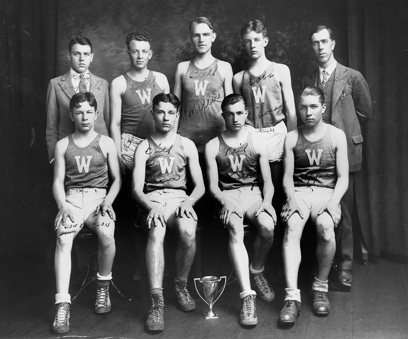 Print, photographic. B/W glossy silver gelatin print of the men’s basketball team, Westminster High School, 1928. 7.875" x 9.625". Shows 7 young men in basketball uniforms and 2 men is street clothes; at center in front is a loving cup. Identified. Front row, viewing left to right: Don Benson; Bill Brown; Neil Woolley; Harry Zepp. Back row, viewing left to right: Pete Campbell; Bill Robinette; Bill Weller; Babs Thomas; ___ Elderdice.Acquisition