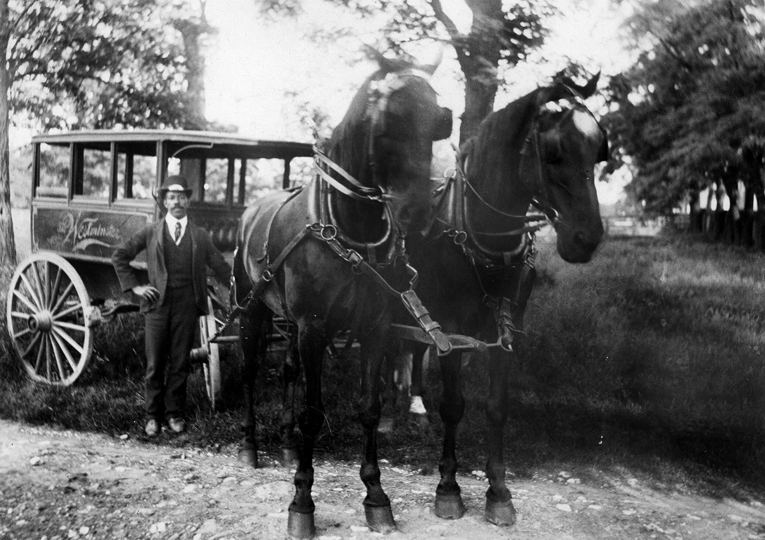 Print, photographic. B/W photograph of the Westminster Hotel carriage used for transporting guests to and from the railroad station. Standing next to the carriage is Tommie Bruce, the driver; there is a pair of dark horses hitched to the carriage; hotel name is painted in script on the side of the carriage. Mounted on black board. Written on back: “Tommie Bruce standing by the ‘Westminster’ Hotel carriage used to transport guests from the train station to the Hotel.” Overall size 10” x 12”; image size 6” x 8.125”.Acquisition
