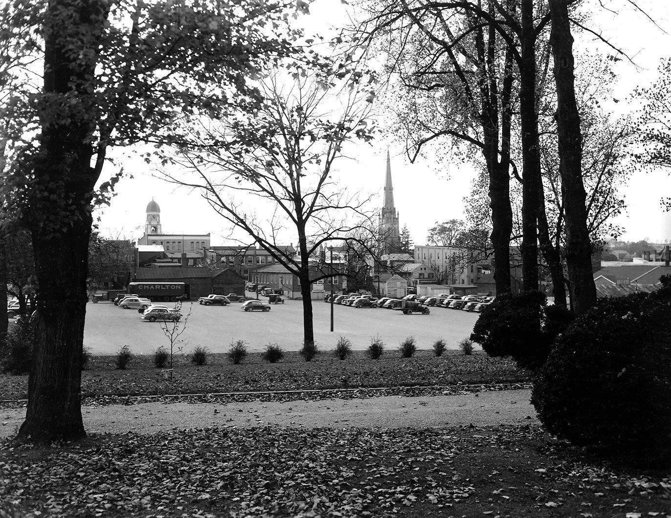 Unmatted black and white image showing Longwell Parking Lot as viewed from front lawn of "Emerald Hill" - Westminster's City Hall and former home of J. K. Longwell. Trees, paved road and grass in foreground. Background shows parking lot and steeple of St. John's Catholic Church and tower of Westminster Fire Dept. Probably dated about 1946. Image size: 4.0" x 5.0"