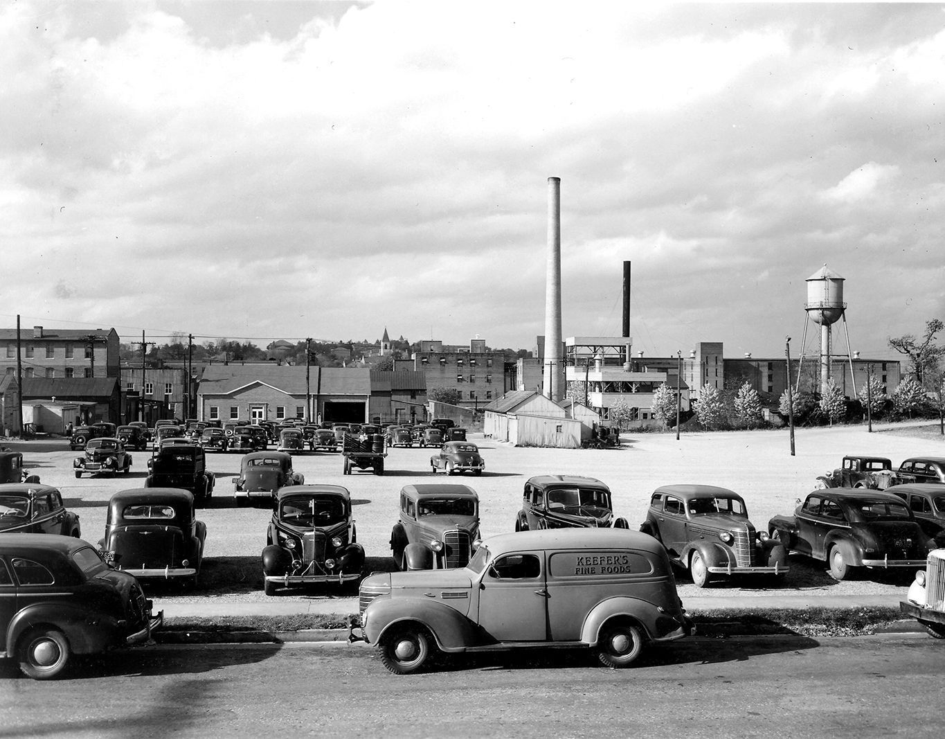 Unmatted black and white print showing Longwell Parking Lot as it appeared from Longwell Avenue looking west toward Railroad Avenue. Probably dated ca. 1946. Image size: 4.0" x 5.0".
