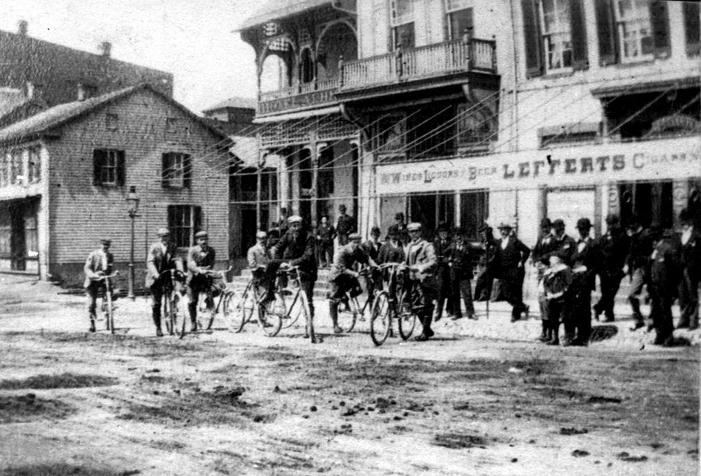 Unmatted black and white image showing men with bicycles gathered at corner of Main Street at railroad crossing. Albion Hotel and Lefferts Store in background. Undated (probably ca. 1900). Image size: 2.5" x 3.5"