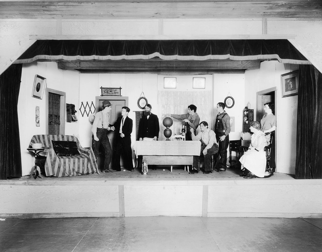 Print, photographic. Westminster Players, The Up Sign, 1935. B/W photo. Photo shows a scene from the play "The Up Sign." Judging from the set the scene appears to be taking place inside. There are eight people in the scene: six men and two women. The set shows a door along the left wall, a door along the back wall and an entry way along the right wall. There is a table in the center of the set with a large glass lamp on it and a couch with a side table to the left. There is a painting to the left of the door along the left wall and a telephone on the right side of it. The man all the way to the left has a cane and the man to his right in a black suit is reaching toward him. Another man is standing to their right with a beard and in a three piece black suit. The next man is holding a lantern, pointing toward the first man and wearing overalls. The next man is sitting at the table and pointing as well. The man farthest to the right is standing and wearing overalls. The first woman is sitting in a rocking chair in the front right corner of the set. The other woman is leaning against the wall of the entryway. The photo is in a gray mat. Mat: 9.5" x 13". Photo: 7.25" x 9.25".
