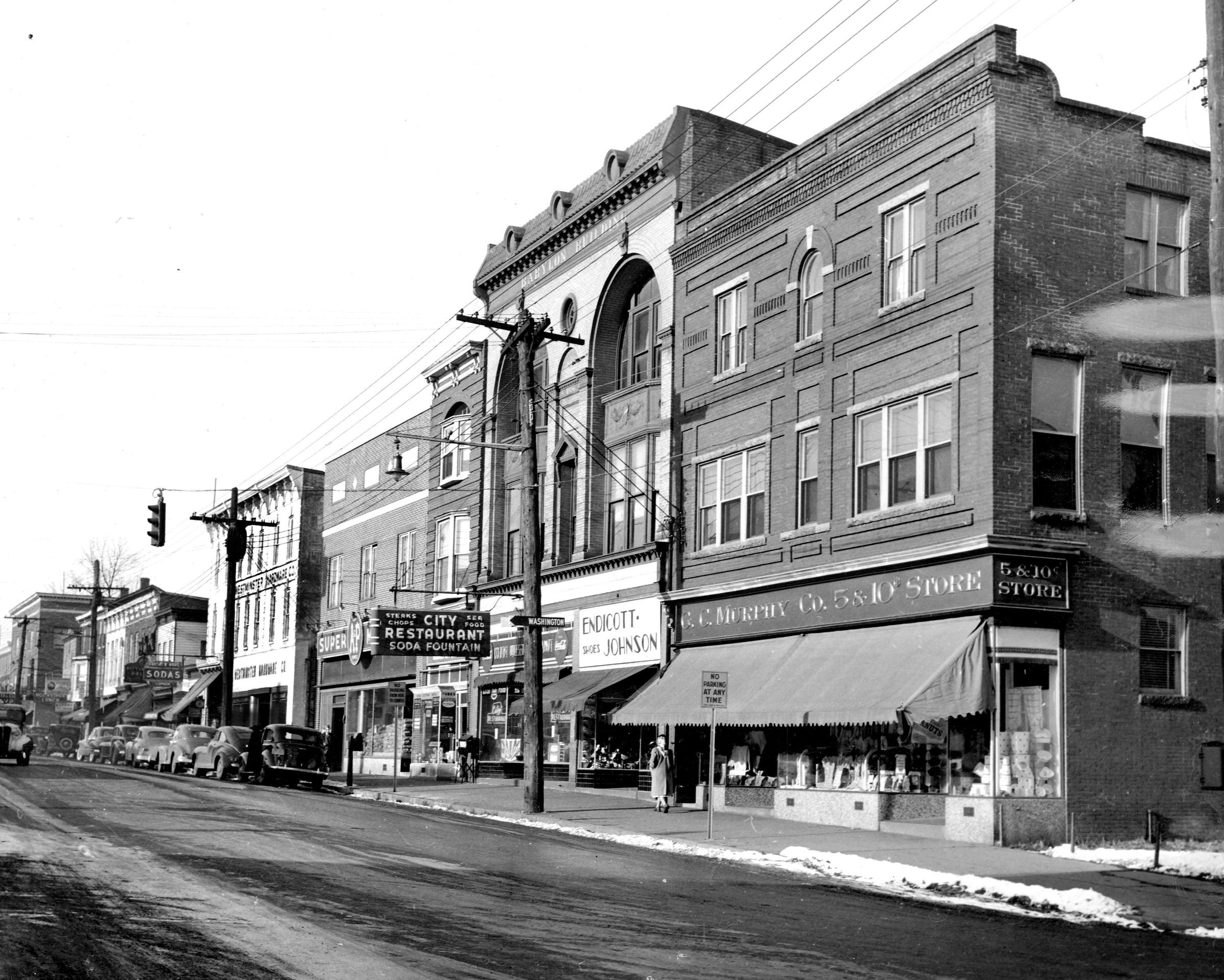Unmatted black and white print showing north side of West Main Street between Railroad Avenue and John Street. Probably dated 1940s or early 1950s. Includes Westminster Hardware Store, C. G. Murphy Co., Endicott-Johnson Shoes and other businesses with cars parked along street. Image size: 8.0" x 10.0".