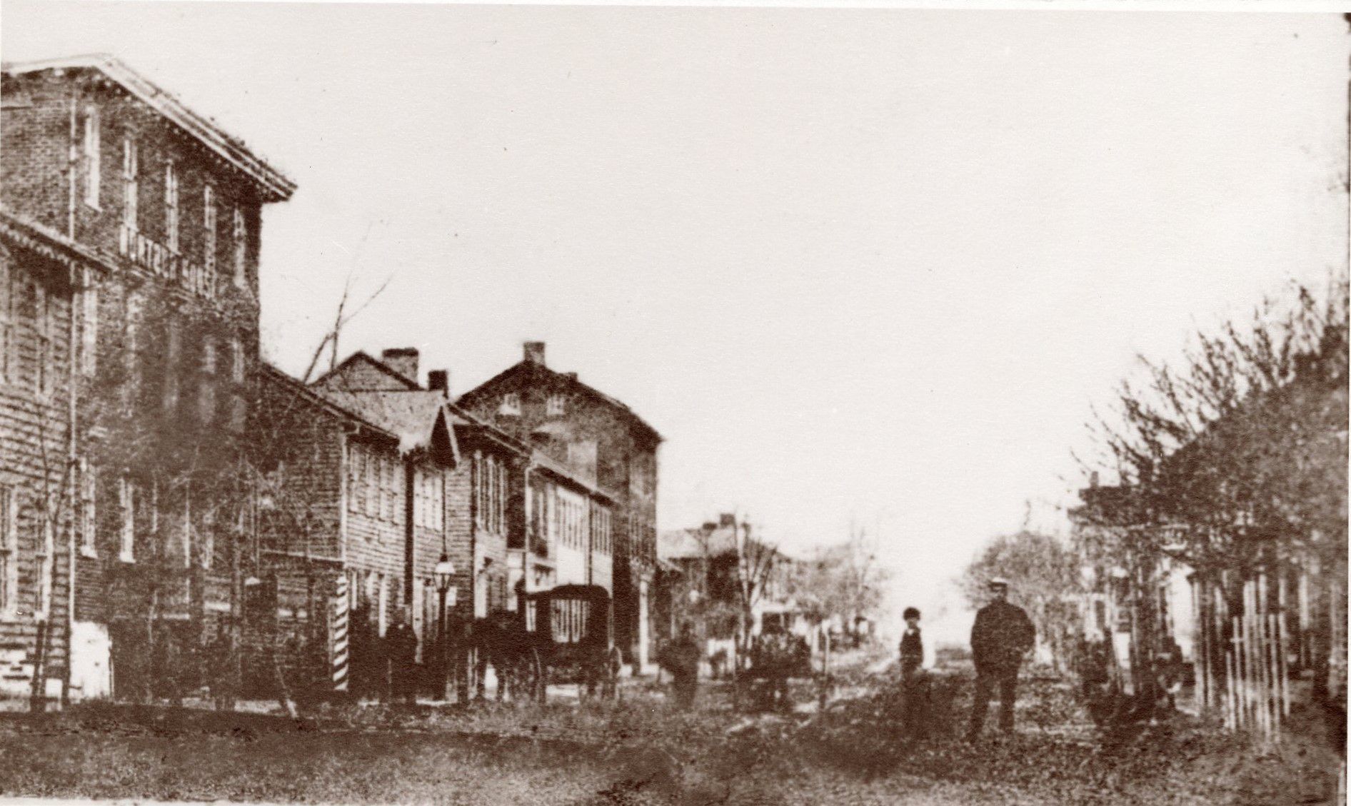 Print, photographic. B/W copy print showing West Main Street looking west from intersection with Bond Street. Clearly shows Montour House and other buildings along street. Vehicle and people in street. Undated but probably from 1860s or 1870s. Mounted. Labeled on back "Copied & Restored 1981 Robert E. Porterfield" Stamped "Porterfield's Photography, 77 East Main St., P.O. Box 522, Westminster, MD 21157 - 301-848-6530". Overall size 10" x 12"; image size: 5.75" x 9.5".Acquisition