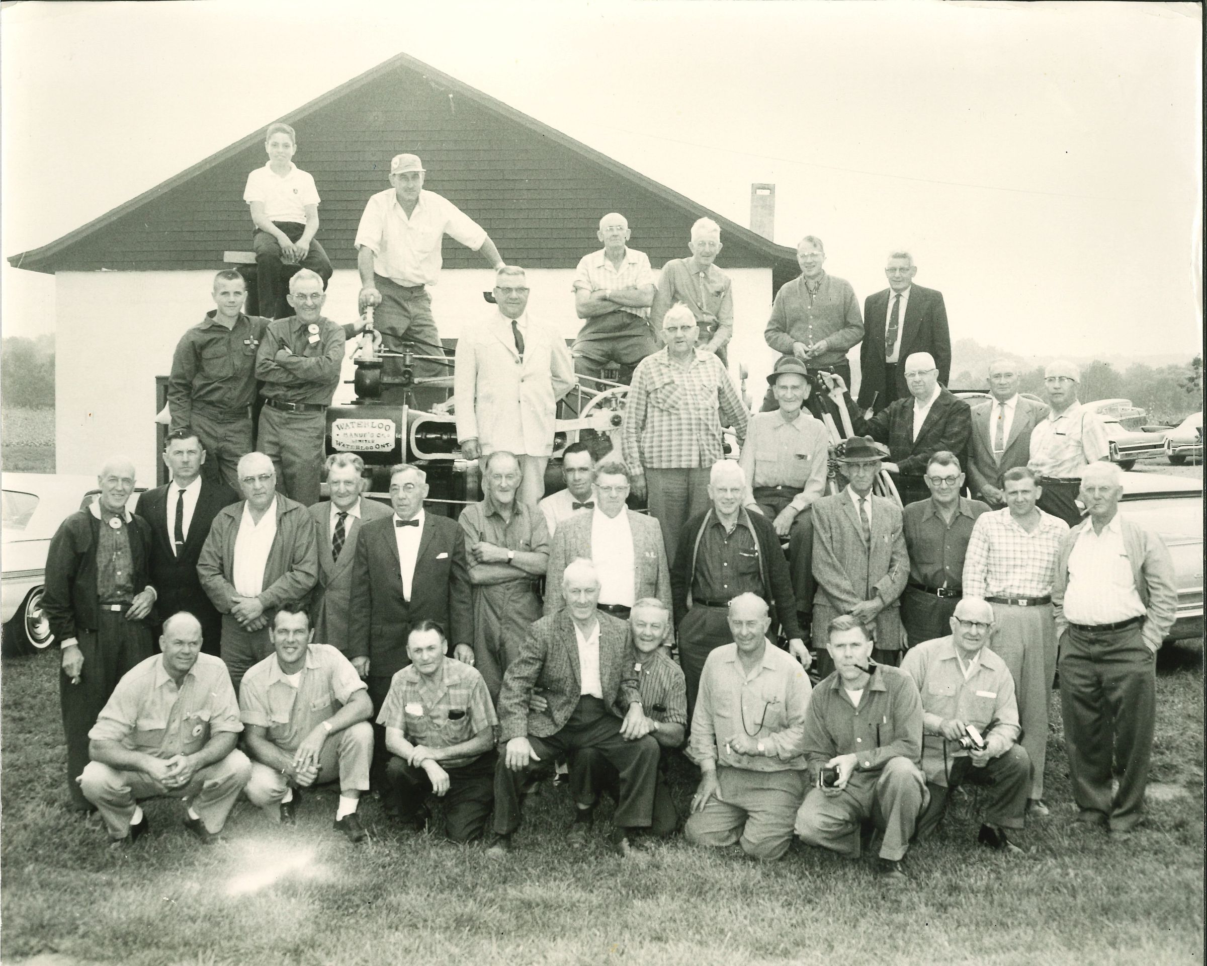 B/W photograph of a group of men posed outdoors around an early 20th century steam engine or tractor. Clothing pictured suggests that this photograph was taken in the 1950s.