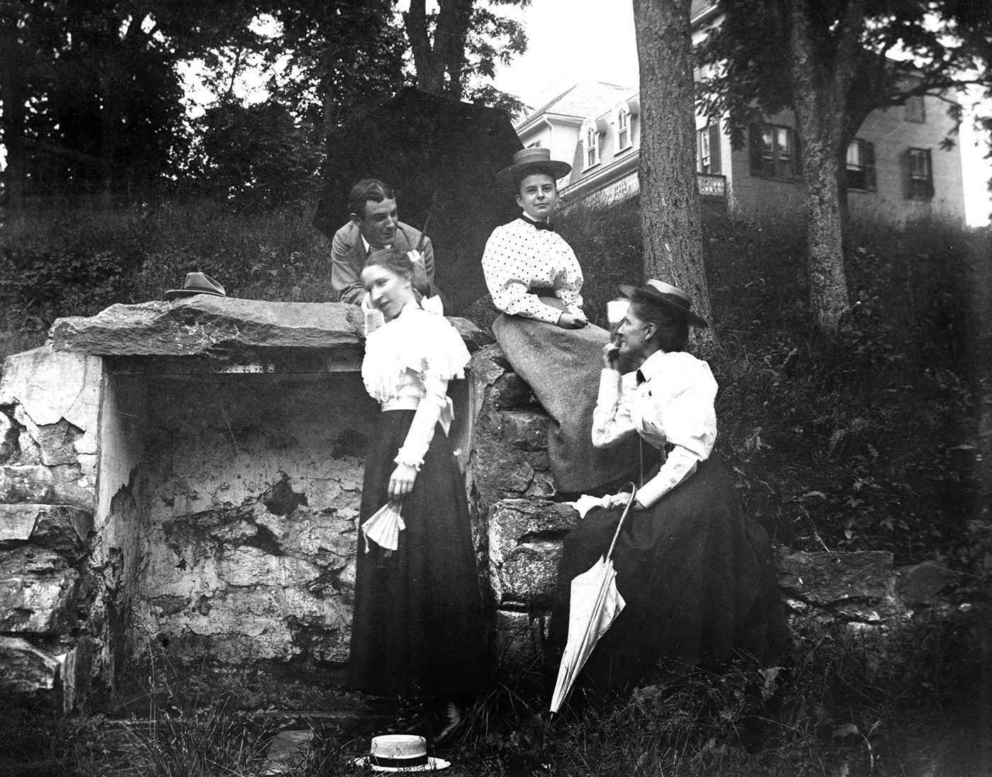 Print, photographic. B/W silver gelatin print mounted on white board with embossed design, 5.25" x 6.25". Image measures 3.75" x 4.75", shows group of four people standing in front of Winchester Place, Westminster, 1 July 1897. Handwritten on back is "Lookout Committee F.P.S.C.E. of M.P. Church. Photographed at Winchester Place by James S. Baer, Jr. July 1?, 1897 Will Mather - Lilly Woodward - Mary B. Shellman - Nan Rinker". In different handwriting is "(Mather, Mrs. Geo. W.) Taken at the old spring - Winchester Place - note by Lillian Shipley."Acquisition