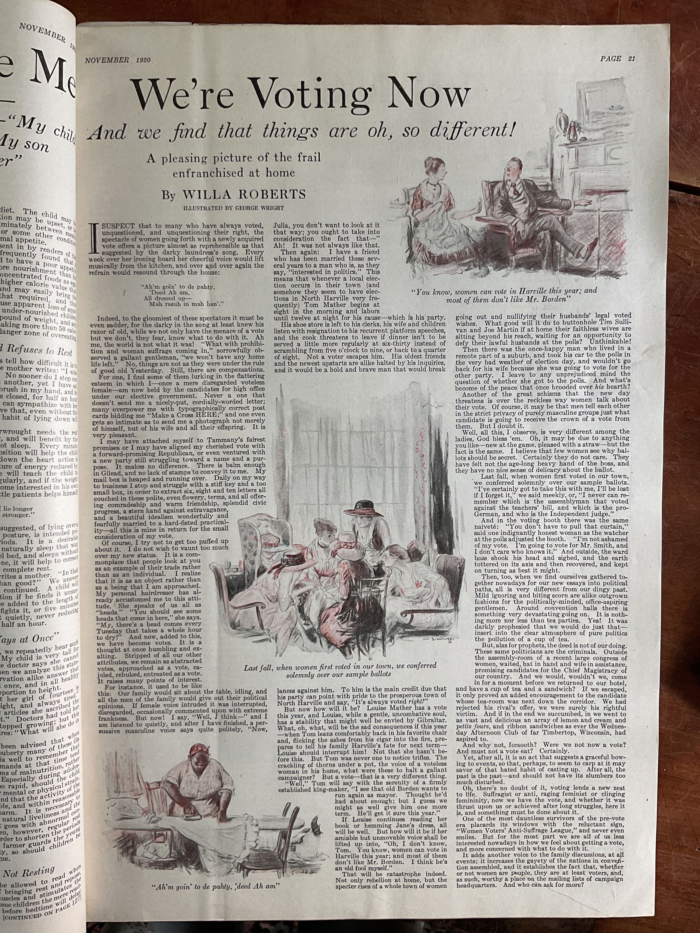 Magazine. Woman’s Home Companion November 1920 edition. Cover features an illustration of a woman with curled dark hair in contemporary 1920s clothing on a blue background with gold text. Page opened to “We’re Voting Now: A pleasing picture of the frail enfranchised at home” by Willa Robert’s, illustrated by George Wright.
