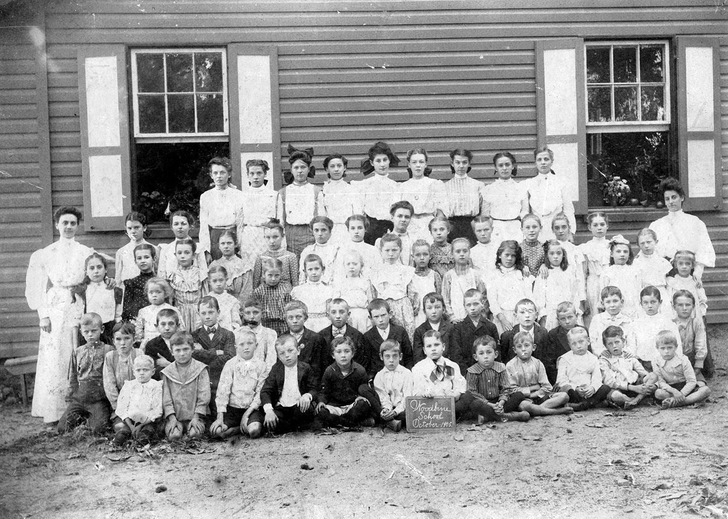 Print, photographic. B/W photo of Woodbine School, 1905. Shows 5 rows of students and teachers posed in front of the frame school. Child at center of front row is holding a chalkboard on which is written "Woodbine School Oct 1905". Mounted on dark gray board. Stamped on back: U.G. McCleary 298 Cedar Avenue Baltimore, Md." Written on back: "School picture Woodbine Md. 1905 Teachers - Miss Pearl Mercer on left Rhoderick on right". 4.75" x 6.625"Acquisition