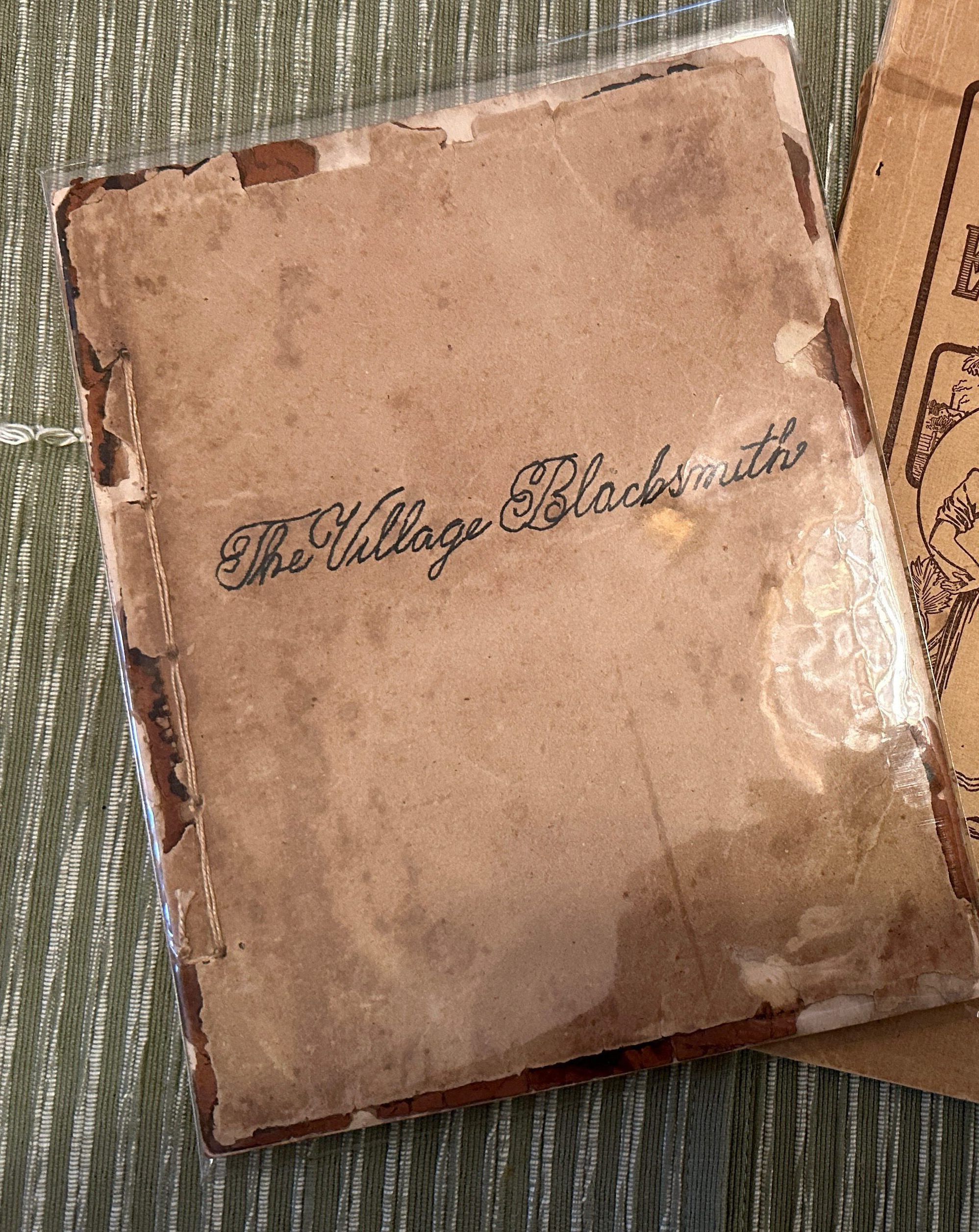 “The Village Blacksmith” was written by Henry Wadsworth Longfellow”. The illustrated poem is a story of the work and life of a village ‘smitty’ or blacksmith. This book is a special edition arranged by Messrs. Houghlin, Miflin & Co., authorized publishers of Mr. Longfellow’s works. The publisher is E.P. Dutton & Co, NYC, 1885. There is also an insignia for Press of Rockwell& Churchill, Boston on the copyright page. The book is in poor condition, being hand bound with a separated and deteriorating front cover. 8”x6”.Location