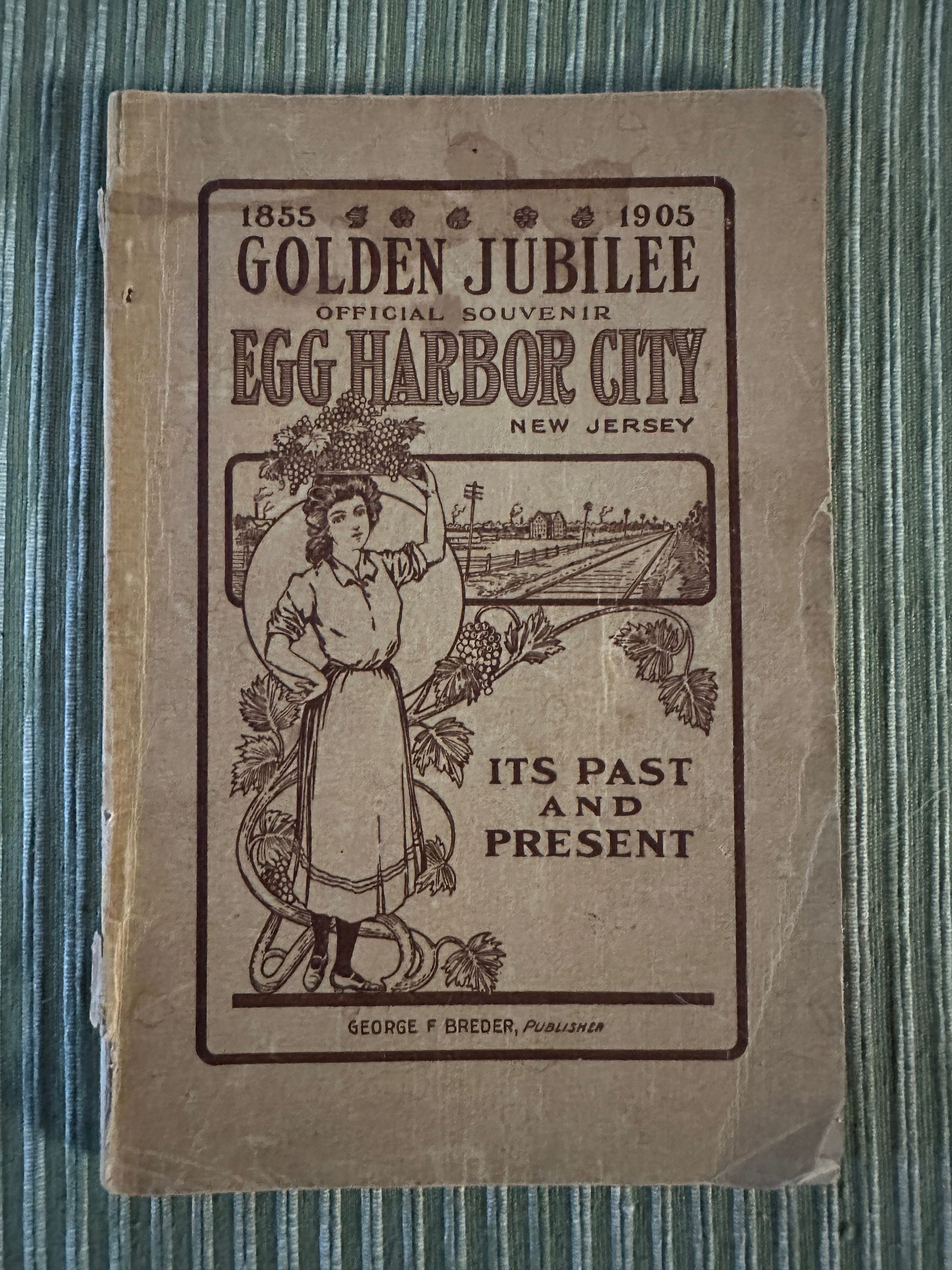 This 1905 edition of the ‘Golden Jubilee Official Souvenir” was published by George F. Breder. The book is written in German and wonderfully illustrated with black and white photos of Egg Harbor City. It is 9” x 6” and has a brown paper cover. The book is in fair condition. Part of the binding is missing and pages are aged.