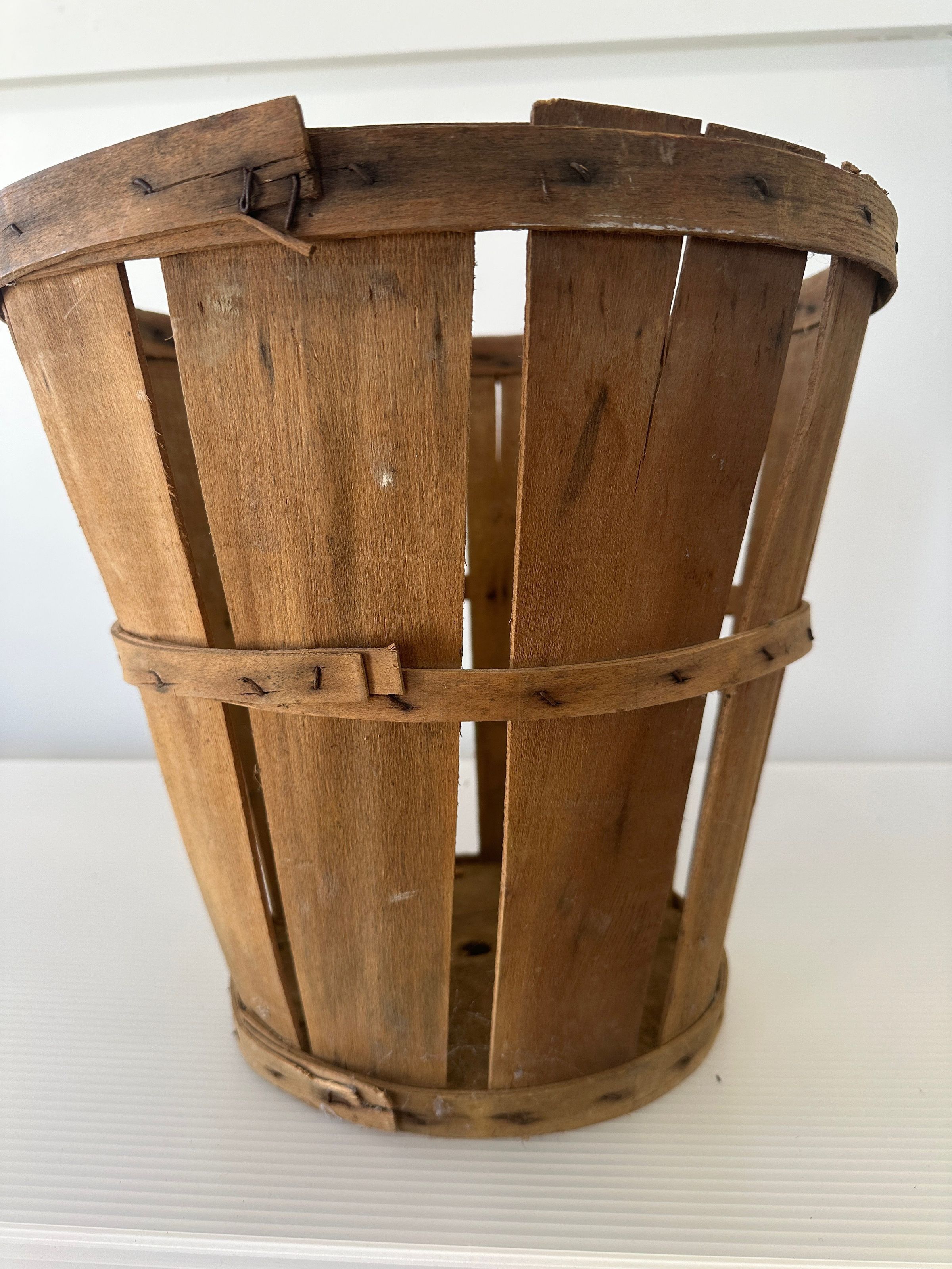 Wooden basket for collecting fruit. H 12”, D 13.25”. Fair condition.