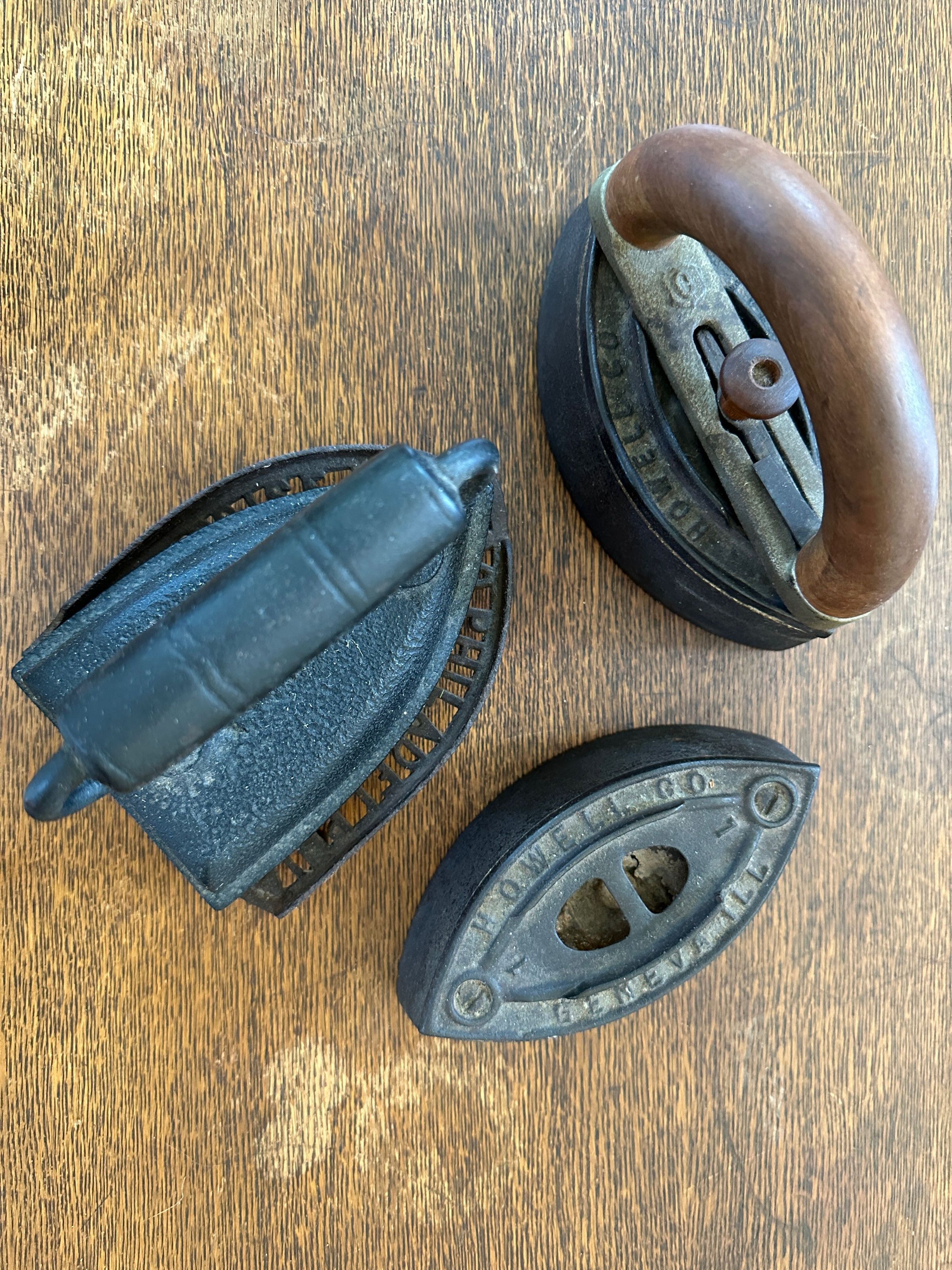 Old Iron and Trivet Collection- made of cast iron 2025.10.1.1- SAD Iron- the pictured iron with a wooden, detachable iron is a SAD iron. This iron was made by the Howell Company of Geneva, IL. It was called a “sad” iron because of its weight… possibly 5-10 lbs. causing the user to work hard! The handle detaches so that it can be attached to other weights for ironing as needed. It belonged to the donor’s grandmother, Angelina Nicastro. 2025.10.1.2- SAD iron without handle 2025.10.1.3- Flat iron and Trivet-dates from Victorian period and was heated and used to iron clothes. The trivet was made in Philadelphia by the Enterprise Mtg. Company.
