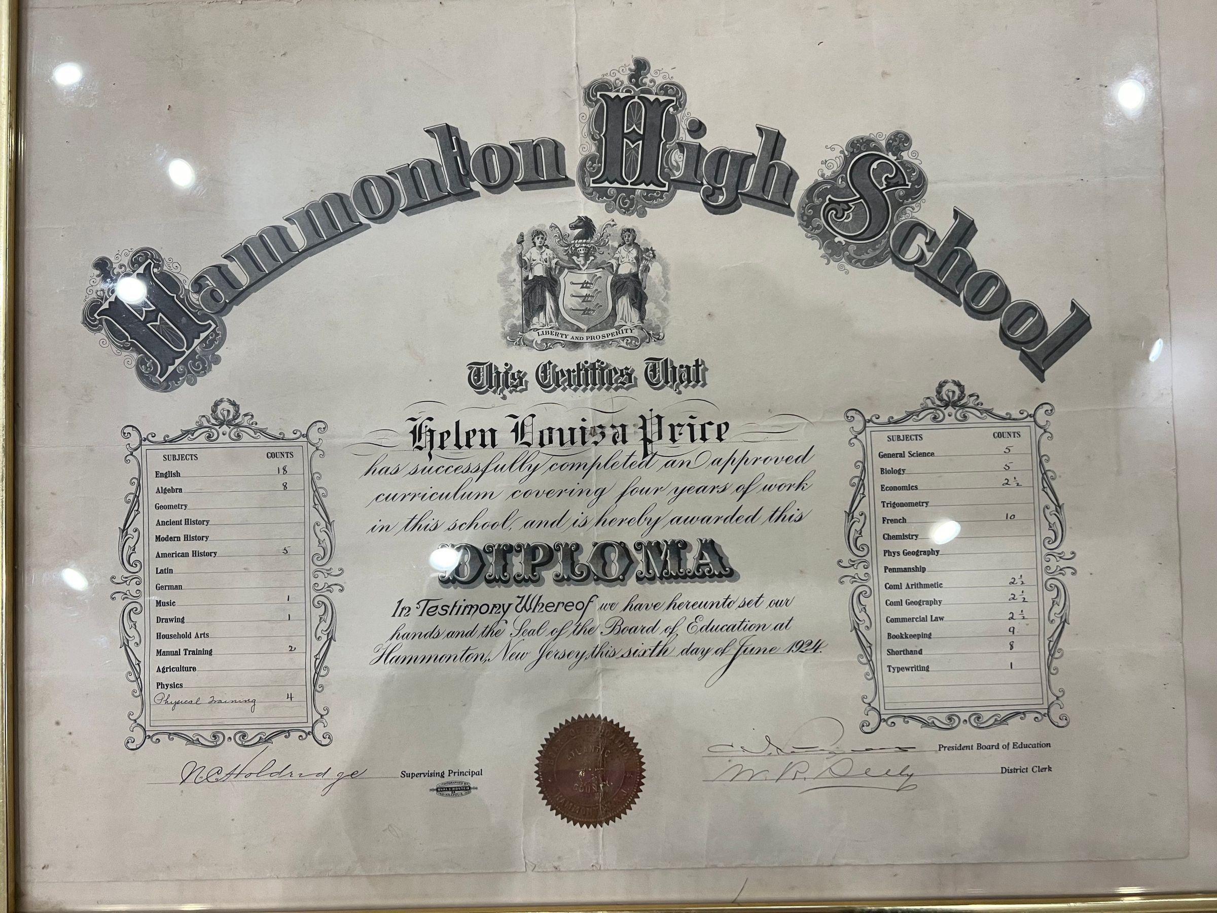 1924 Hammonton High School Diploma Presented to Helen Louisa Price dated 6/6/1924