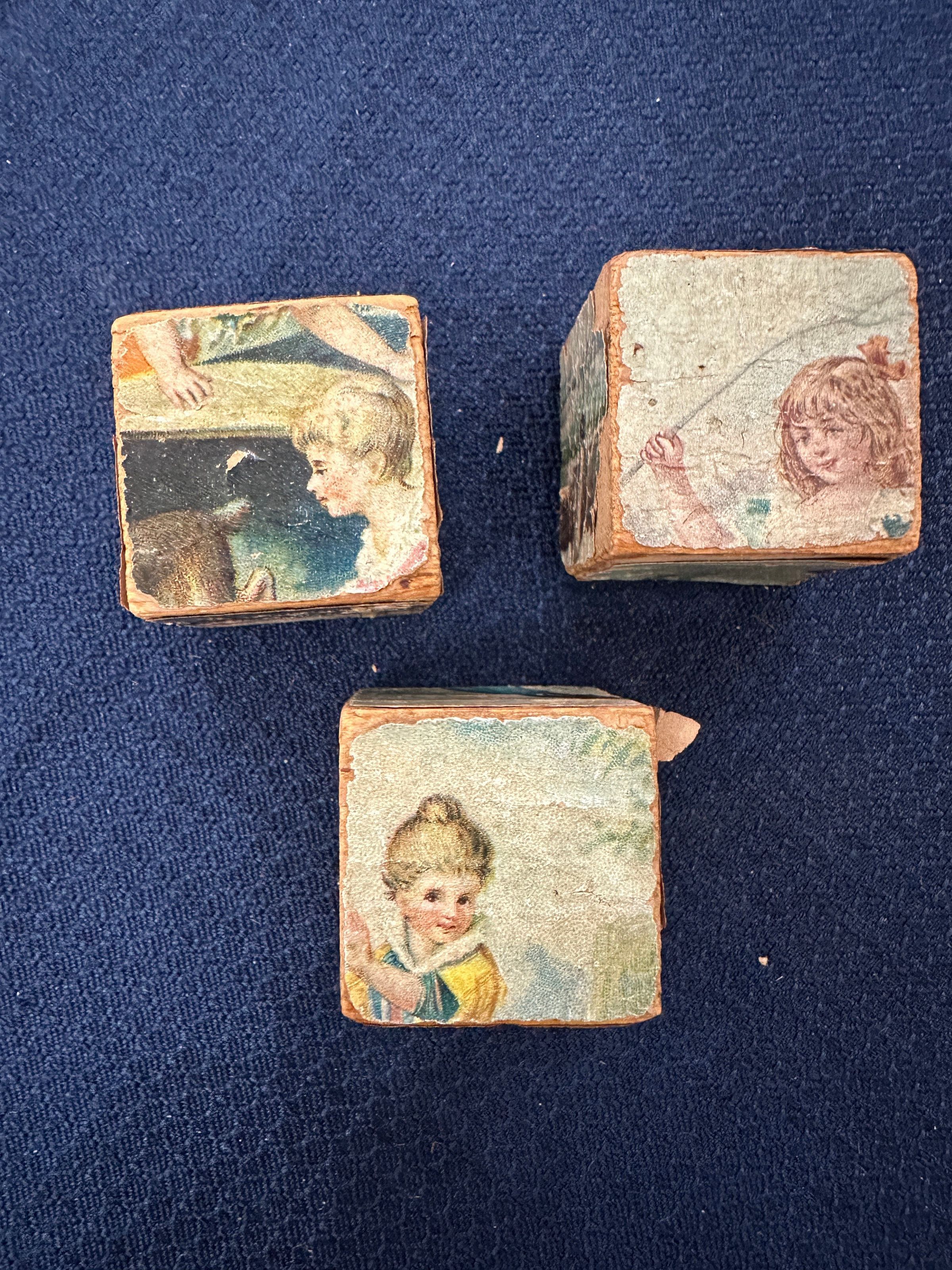 Children’s Wooden Blocks, paper covered with 4 different scenes. Part of a 12 block set. Circa 1880-1910.